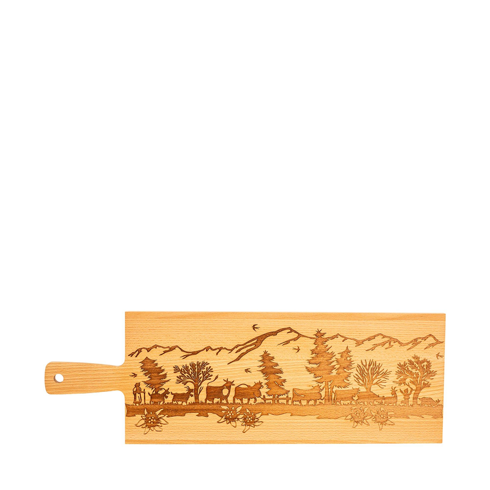 Planche de service et à découper en bois de hêtre massif gravé au laser de Kadastar. Bois allemand issu d'une sylviculture durable, gravé avec amour en Suisse sur nos propres machines. • Bois: hêtre certifié FSC®, Allemagne • Dimensions: 60 x 20 x 2 cm Conseils d'entretien: nettoyer à la main avec de l'eau tiède et un chiffon doux ou une éponge. Ne pas utiliser d'abrasifs, d'acides, etc. Peut être re-huilé. Ne résiste pas au lave-vaisselle.