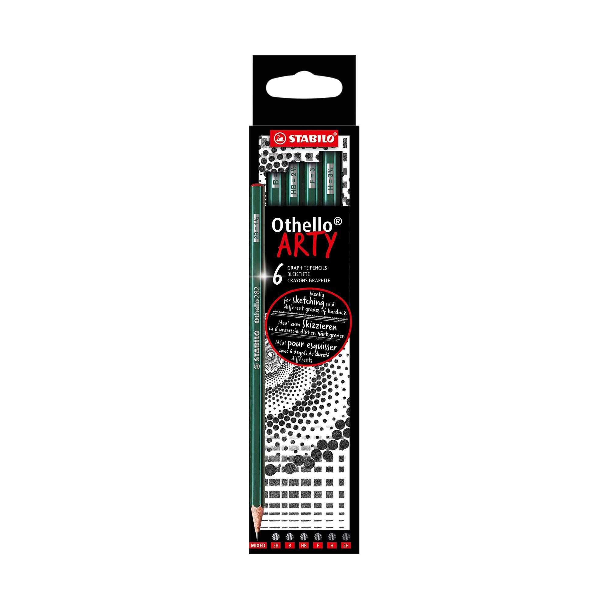 STABILO® Crayon Othello ARTY étui de 6 MIX • STABILO classique hexagonal - dessin en bande • Surfaces peintes et agréablement adhérentes • Crayon hexagonal avec dessin en bande STABILO classique sans gomme • Recharge incassable • Épaisseur de recharge : env. • 2,2 - 3 mm (selon le degré de dureté) • Un ensemble polyvalent parfait avec différents degrés de dureté • Application : esquisse, dessin technique, travail artistique, ombrage, dessins à main levée et écriture • Exécution du contenu avec le paquet : étui de 6 assortis en 6 degrés de dureté : 1x 2B, B, HB, F, H, 2H chacun.
