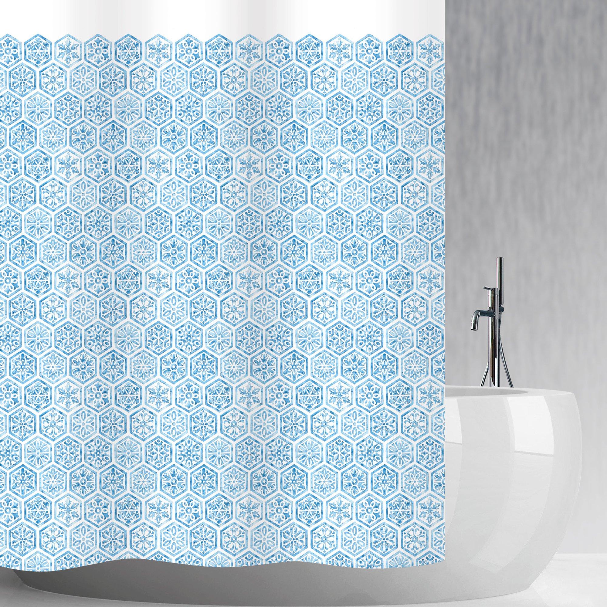 Aspect carrelage au look azulejos peint à la main.• Tissu dense à séchage rapide • Tombe particulièrement bien, finition de haute qualité • Qualité raffinée au téflon • Avec œillets robustes (également compatible avec les tringles à rideaux avec patins)