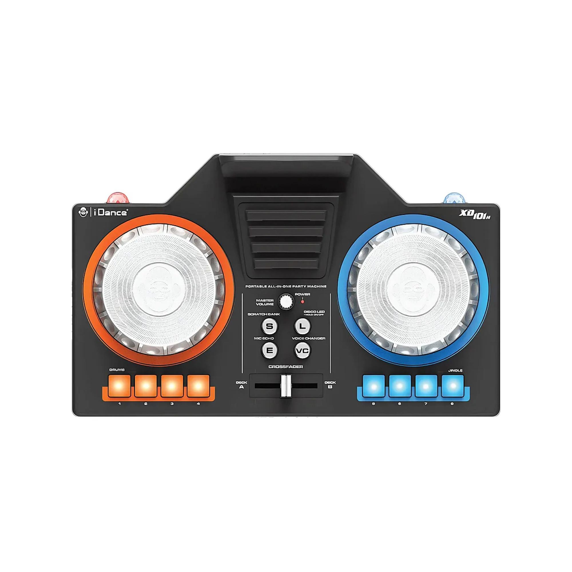 XD201. 3 en 1: haut-parleur KARAOKE + table de mixage DJ + éclairage disco. Mixer pour iPad / iPhone / Smartphone avec CROSSFADER intégré pour mixer vos chansons . Haut-parleur 5 WATTS intégré + support pour tablette / téléphone pour vos appareils intelligents. 2 platines à gratter comme un DJ professionnel. PAD avec 4x sons de batterie pour faire vibrer votre musique. PAD avec 4x jingles offrant 2 MODES DE LECTURE. 2x BOULES DISCO à l'arrière pour étaler les motifs sur votre mur. Entrée microphone avec ECHO et VOICE CHANGER. Microphone inclus avec 2x boutons pour accéder aux jingles. Sortie casque pour suivre vos chansons. Sortie auxiliaire AUDIO pour connexion à un système de sonorisation. Alimenté par 4 piles AA (non fournies). L'application CROSS DJ (pour la fonction Crossfader) est vendu séparément sur iTunes ou sur le GOOGLE Store. Alimentation DC-DC incluse.