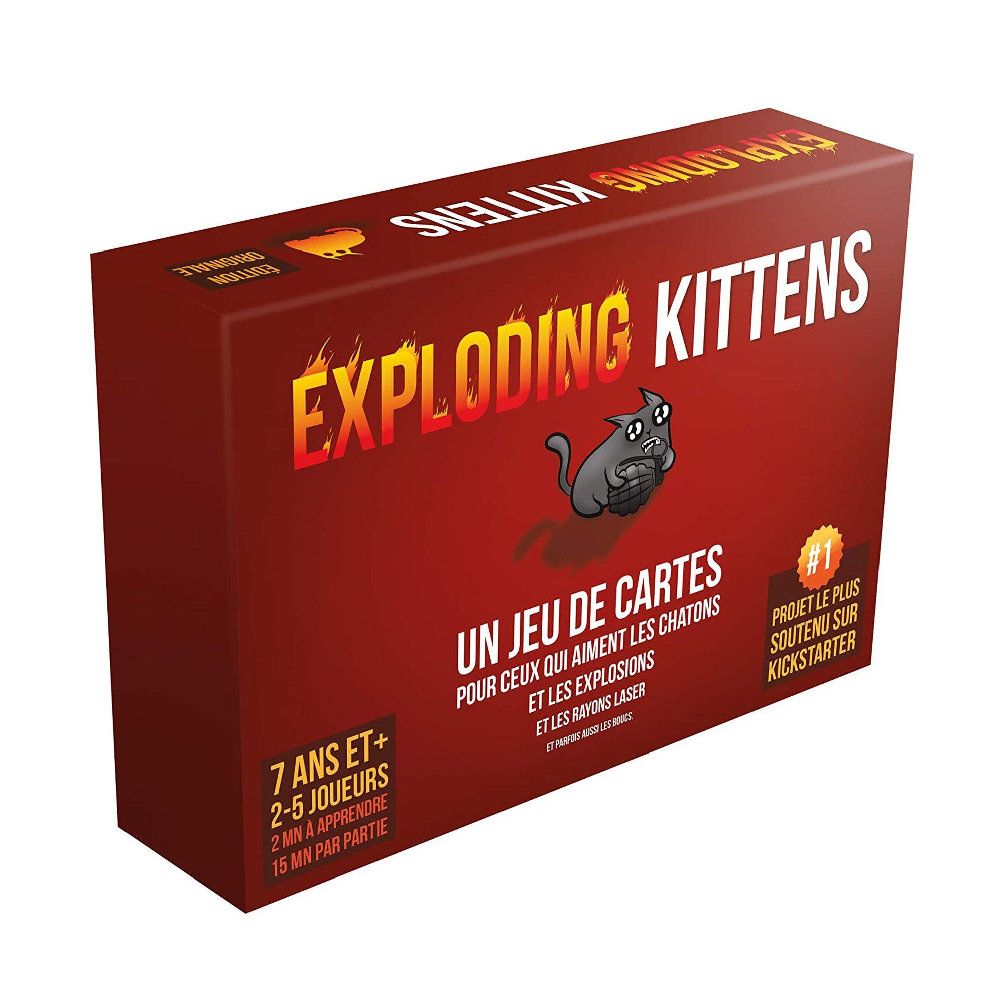 Une version tactique de la roulette russe - juste avec des chatons au lieu de cartouches. Les joueurs tirent des cartes à tour de rôle jusqu'à ce que l'un d'eux tire un chaton qui explose. Il explose immédiatement, meurt et est éliminé - à moins qu'il n'ait une carte désamorçante. Il peut ainsi calmer le chaton et l'empêcher d'exploser, par exemple à l'aide d'un pointeur laser, de l'herbe à chat ou d'un crawl. Toutes les autres cartes n'ont qu'un seul but : vous empêcher de tirer un chaton qui explose
