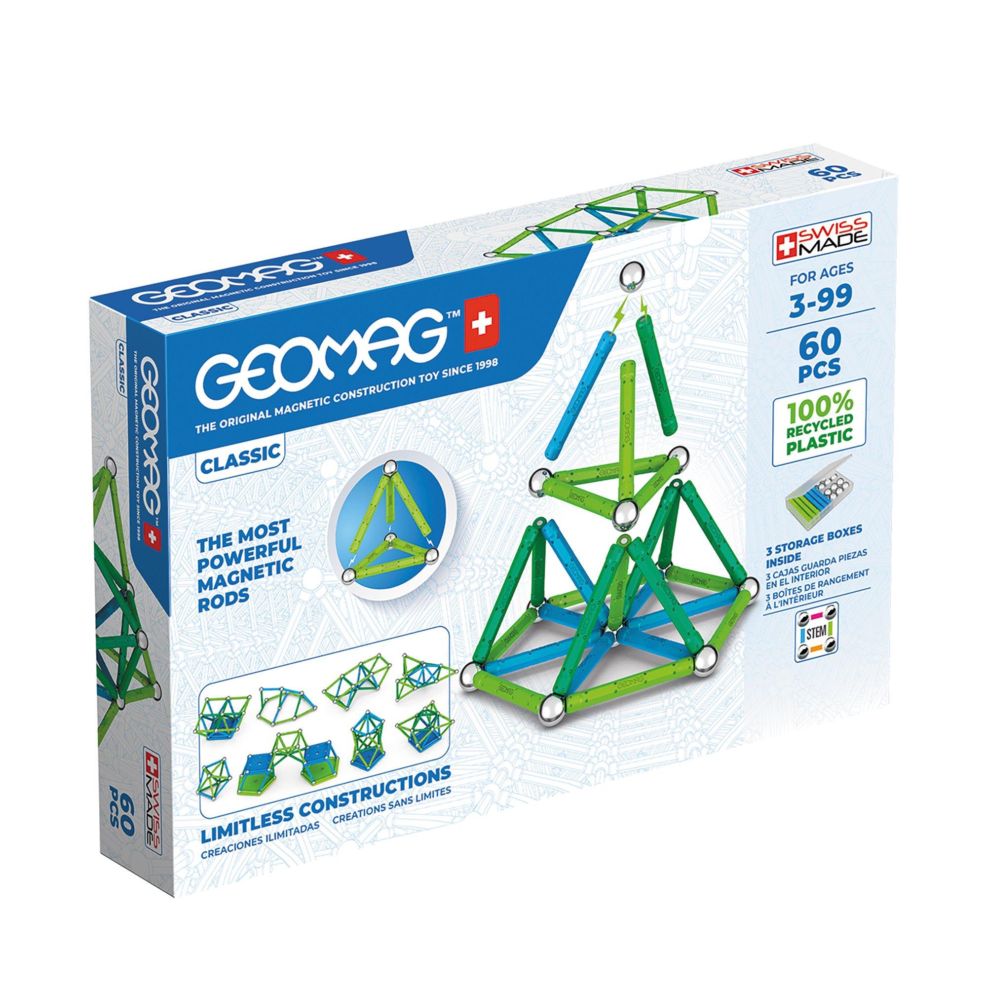 Contenu: 28 barrettes magnétiques, 28 billes en métal, 2 plaques carrées de base et 2 pentagones de base. GEOMAG - Made in Switzerland.