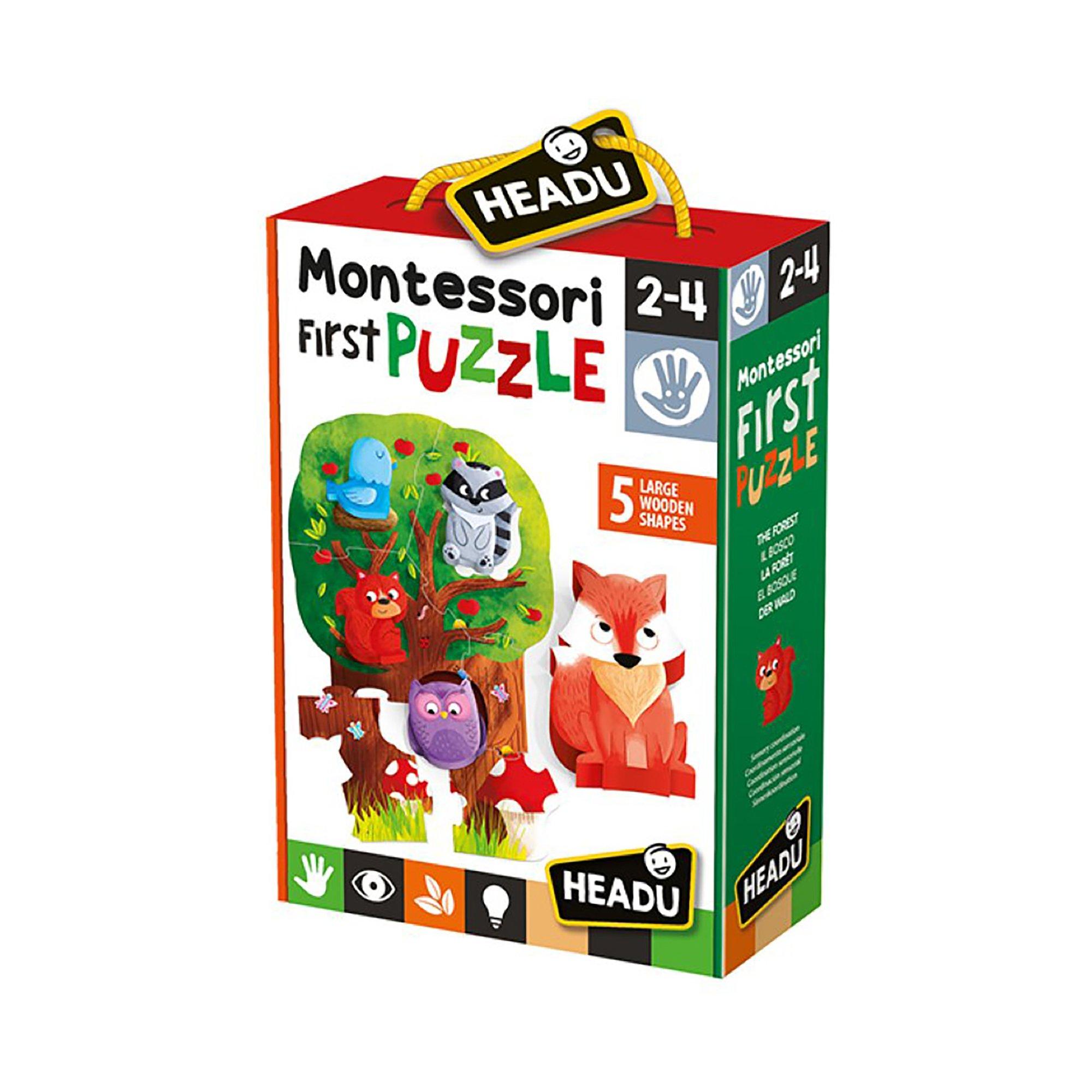 Montessori First Puzzle the Forest - Age : 2-4. Jeu pour le développement de la coordination sensorielle. Après avoir assemblé le puzzle extra-épais, l'enfant peut placer les animaux en bois aux endroits appropriés. Le jeu est fabriqué avec des matériaux de haute qualité qui conviennent même aux plus jeunes enfants.