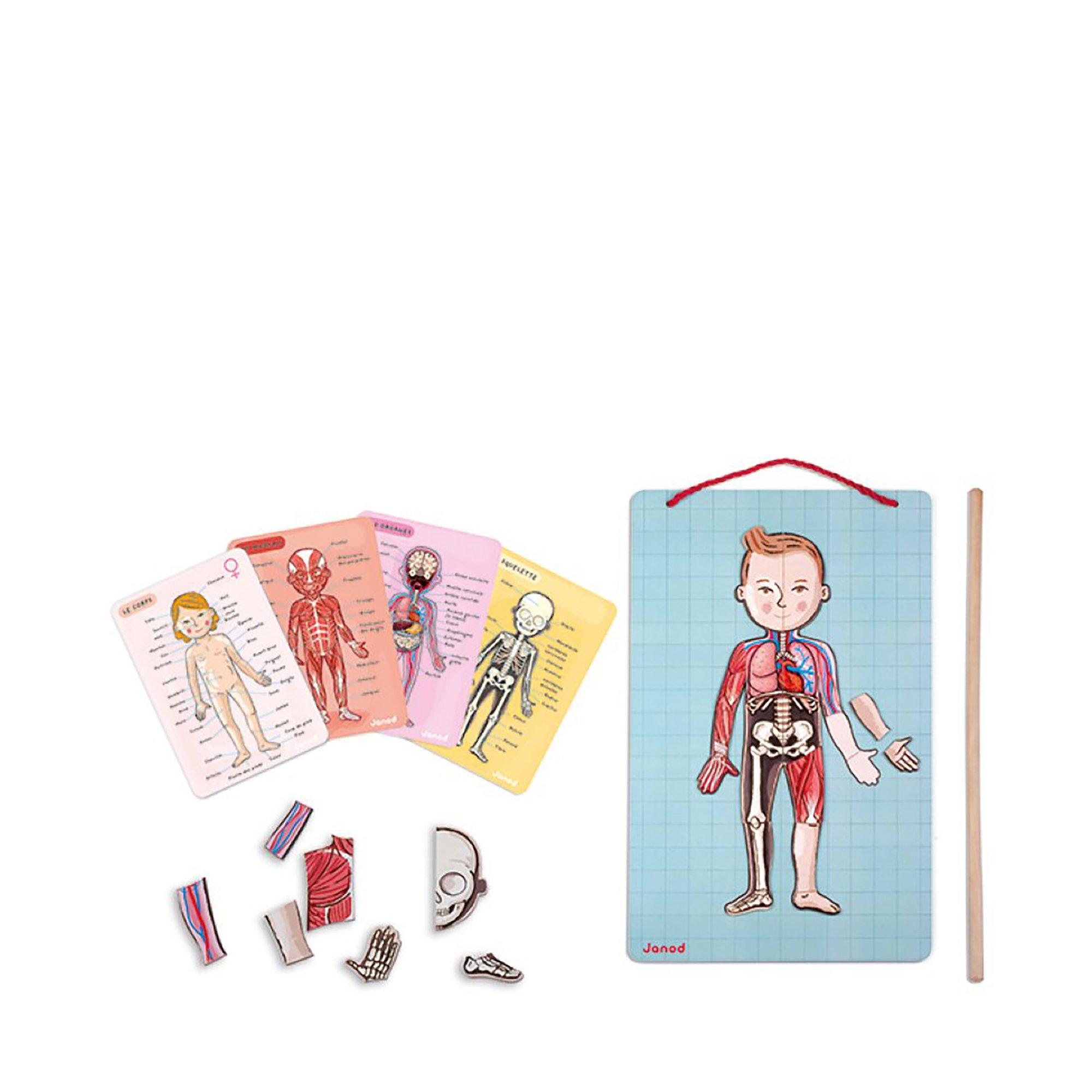 Bodymagnet, jeu pour enfants de 7 à 12 ans, 99 pièces. Apprends le corps humain tout en t'amusant. 76 magnets et 1 support magnétique pour recomposer et apprendre les différentes parties du corps humain. 4 cartes avec descriptif détaillé sur: le squelette, les organes, les muscles et le corps (cartes en français, anglais, allemand, néerlandais, espagnol, catalan, basque, italien, russe, danois et japonais). Livré avec une baguette en bois.