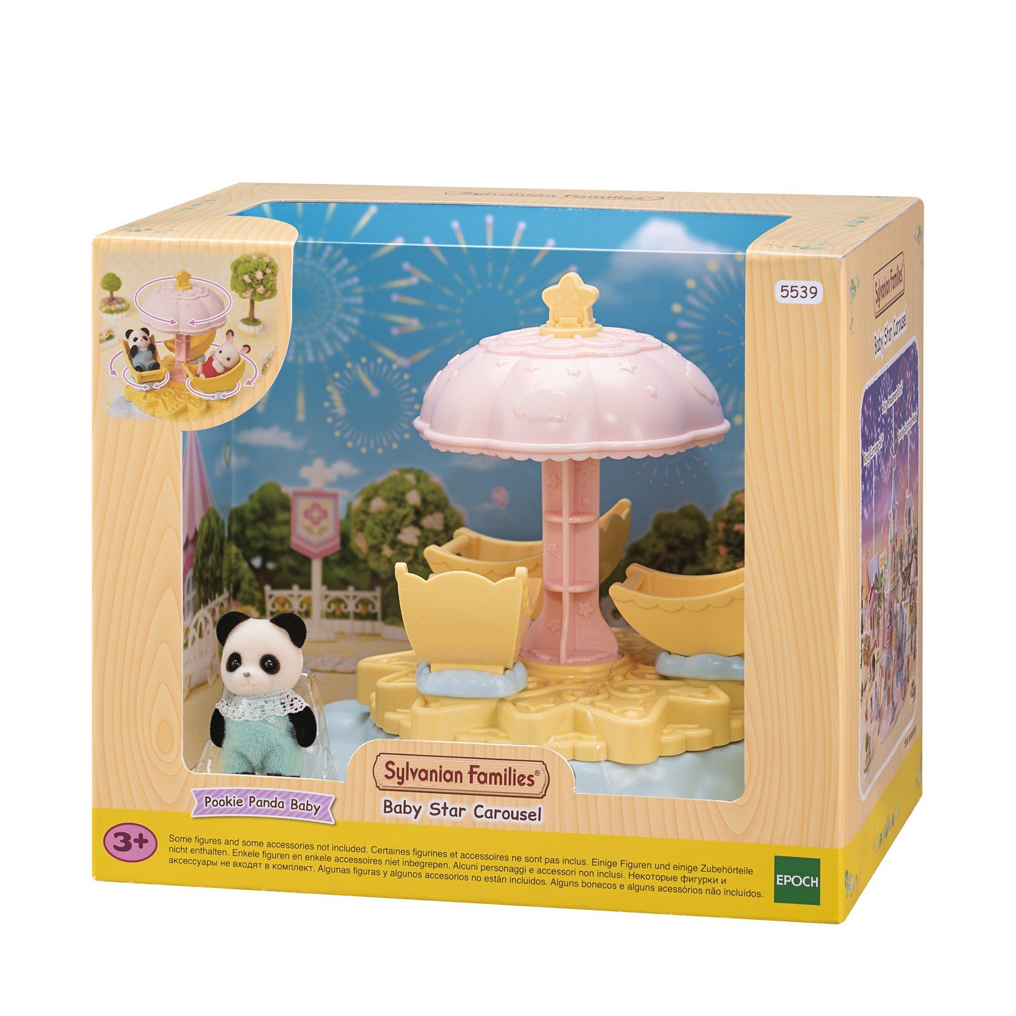 Le bébé panda s’amuse beaucoup dans carrousel étoilé ! Il s’installe dans l’une des nacelles, c’est parti pour un tour. Actionne la poignée en forme d’étoile pour faire tourner le carrousel et observe les étoiles cachées sous le toit. Contient le bébé panda. Viens jouer avec nous ! Sylvanian Families – des souvenirs pour la vie.