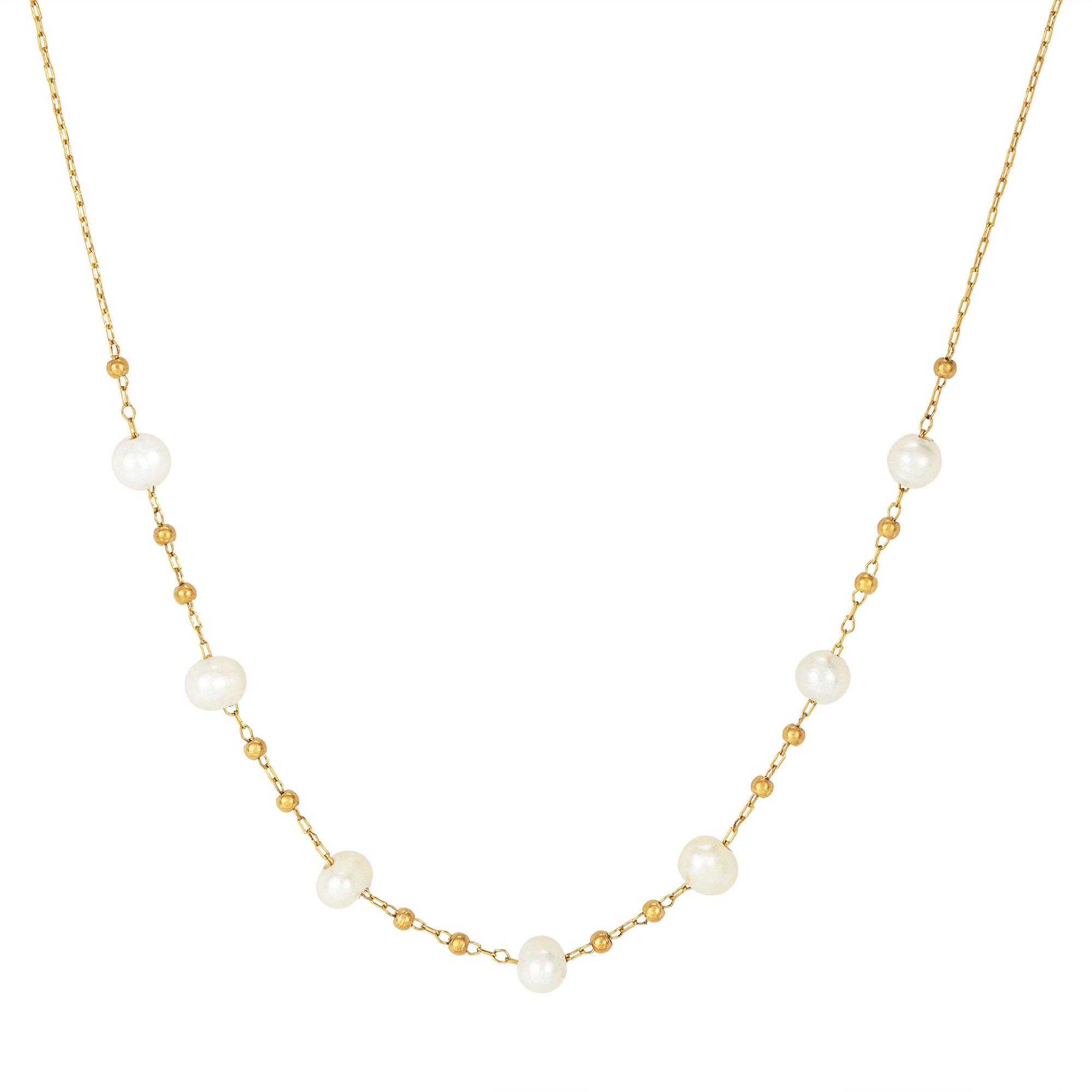 Ce collier polyvalent et d'une élégance intemporelle de ZAG Bijoux avec des perles en nacre fine sur une simple chaîne en acier plaqué or complète parfaitement toutes les tenues et est particulièrement époustouflant sur les peaux ensoleillées.