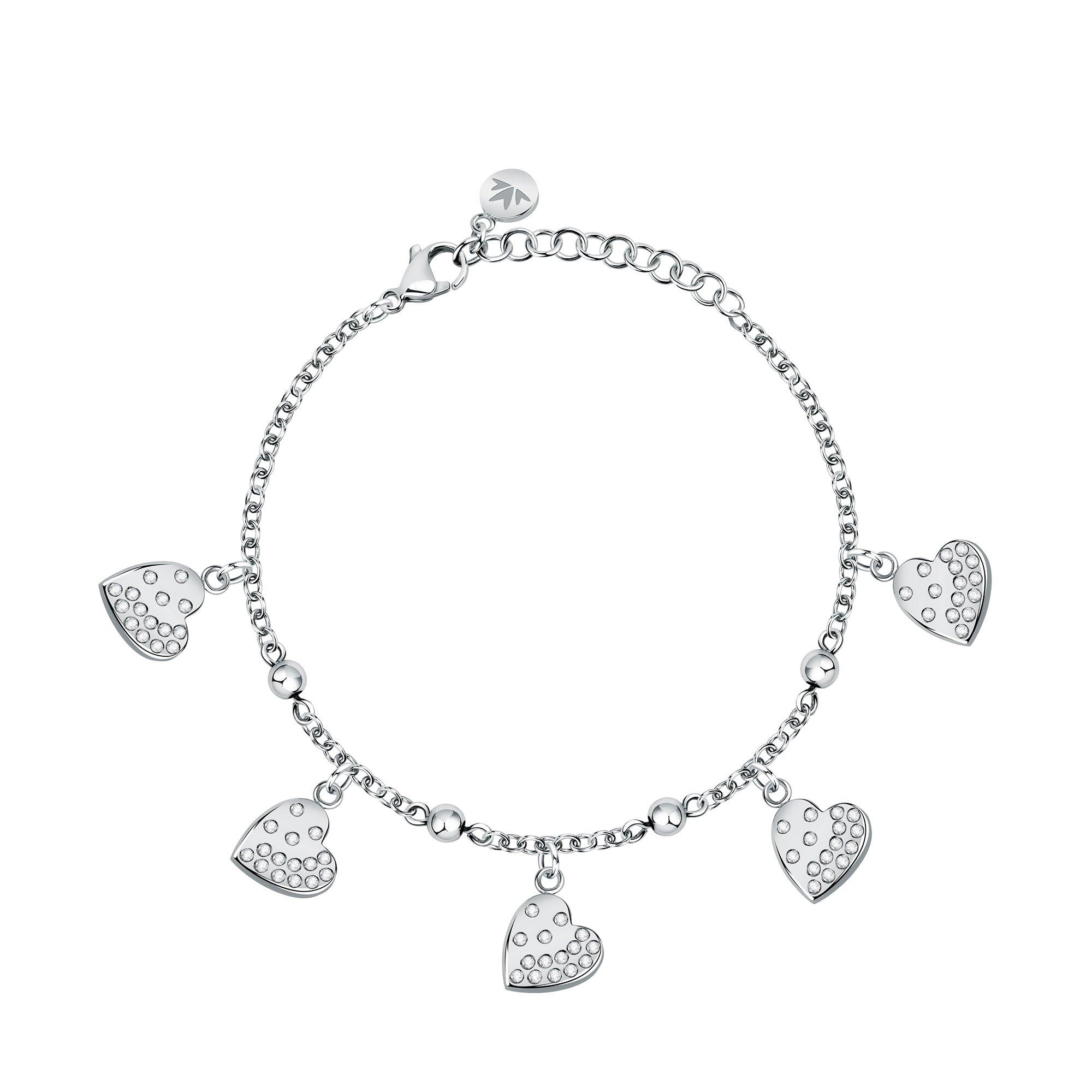 Ce charmant bracelet de la marque MORELLATO est en acier inoxydable et est orné de breloques cœur étincelantes. – Un vrai accroche-regard.