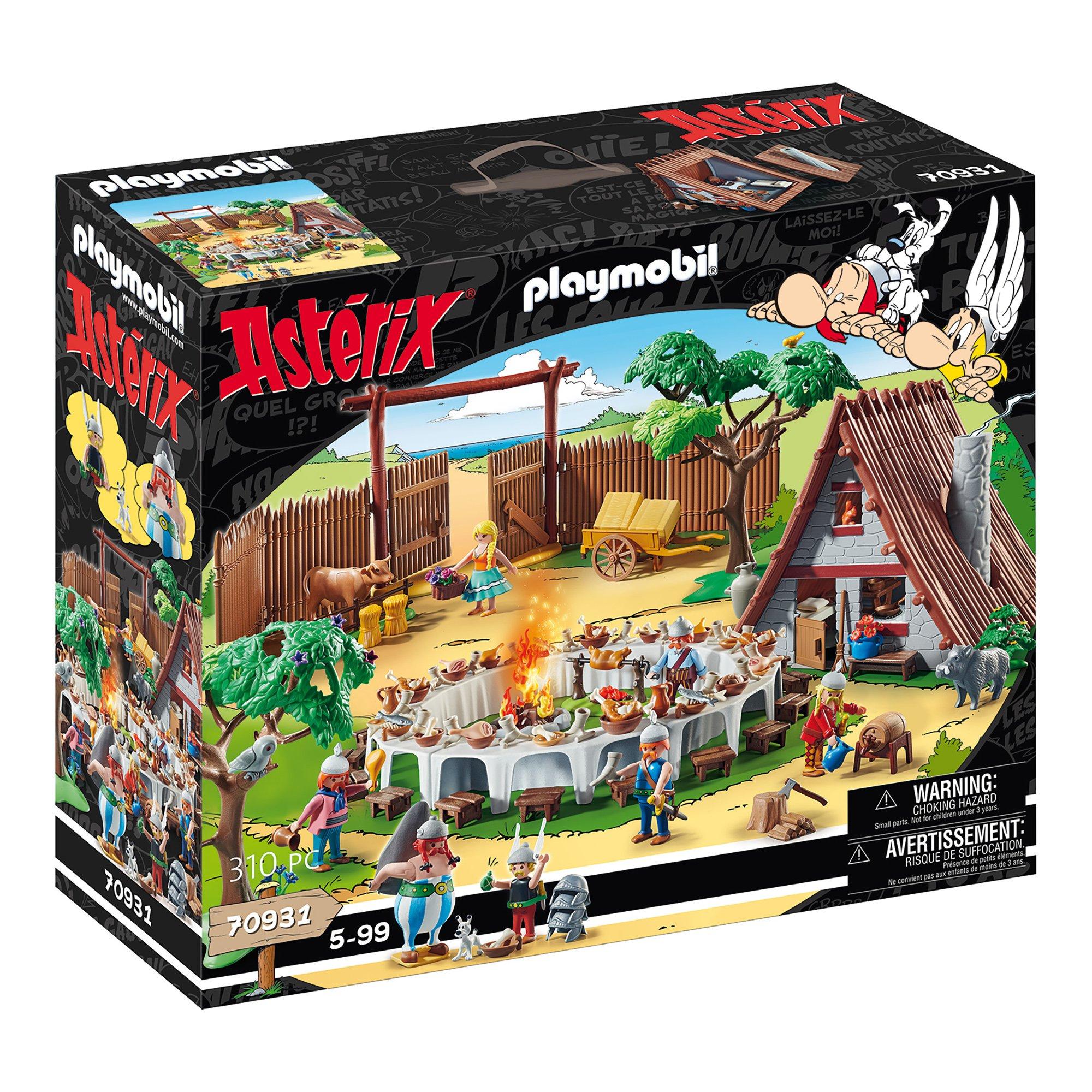 A la table du banquet, 18 gaulois peuvent s'installer. Le traditionnel sanglier est grillé à la broche. La hutte d’Astérix s'ouvre par le toit et contient de nombreux accessoires. On retrouve le village Gaulois avec un puit ainsi que des palissades. Avec les personnages Astérix, Obélix, Idéfix ainsi que d'autres gaulois. Dimensions de la hutte d'Astérix : 25 x 24 x 23 cm (LxPxH); Dimensions du portail avec palissades : 70 x 9,5 x 21 cm (LxPxH); Dimensions de la table du banquet : 30 x 30 x 4 cm (LxPxH).
