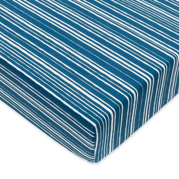 Ce drap-housse de Desforges en percale pur coton est tissé finement et serré, ce qui lui donne son aspect mat et lisse. Il procure une sensation de douceur, de fraîcheur et de légèreté. Il tire son look maritime du design rayé bleu aigue-marine et blanc irrégulier.