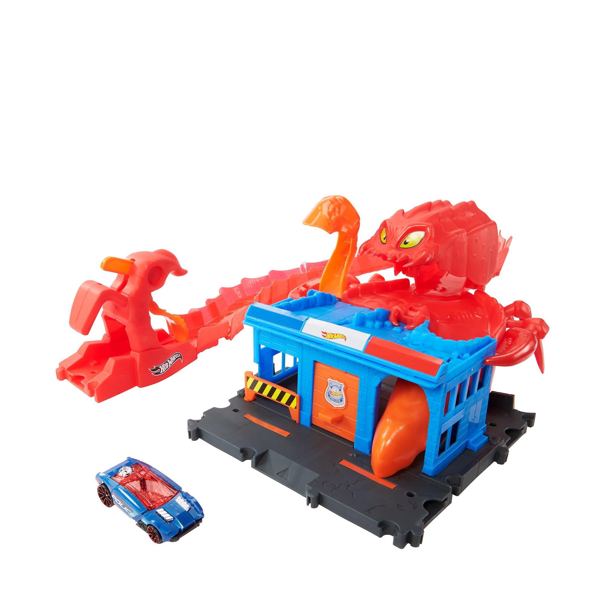 Sven le scorpion a ses griffes profondément enfoncées dans le commissariat et il a encore plus faim ! Le circuit mesure environ 76 cm de long et les enfants envoient leurs voitures de la rampe de chute vers l'une des deux routes de fuite qui traversent le commissariat. L'ensemble comprend un véhicule Hot Wheels et peut être relié à d'autres ensembles pour encore plus d'aventures remplies de créatures Les enfants adorent le plaisir de collectionner. Tous les articles sont vendus séparément. Sous réserve de variations de couleur et de conception.