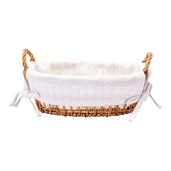 Panier en osier avec deux poignées et un insert en tissu. Peut être utilisé pour présenter des aliments secs, pour d'autres types de stockage, comme panier cadeau ou décoration.