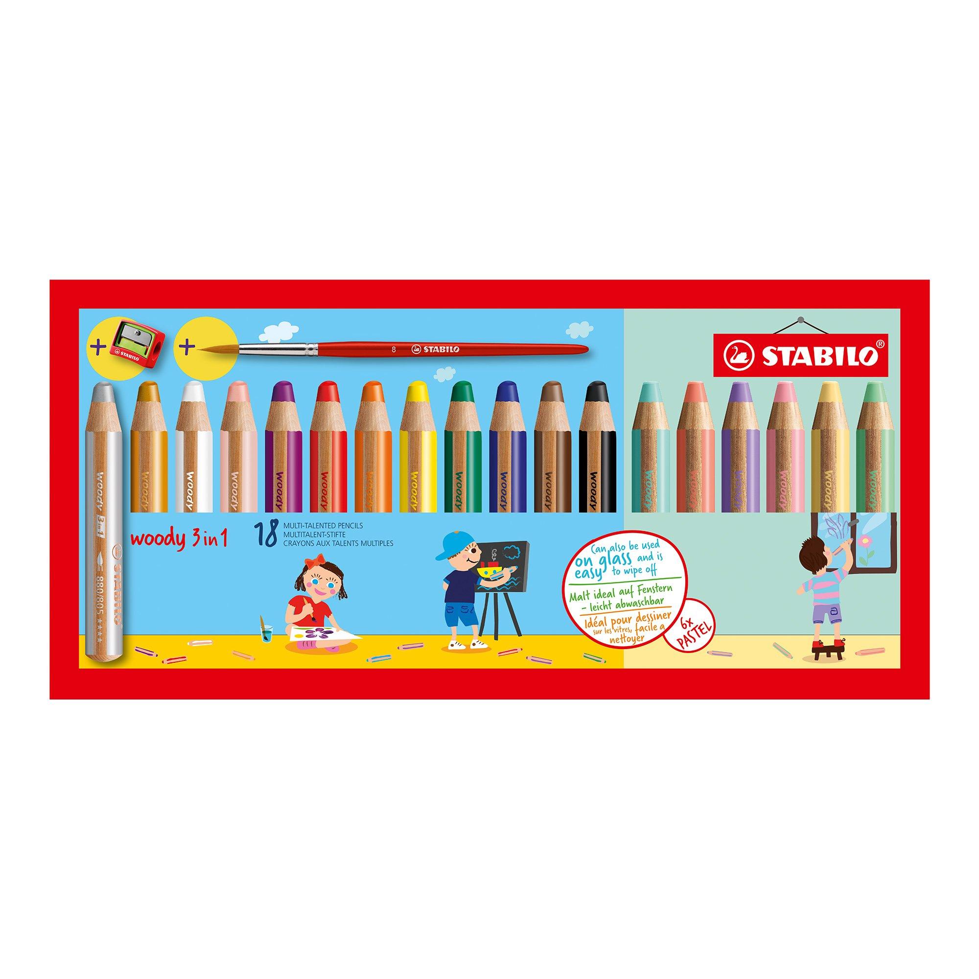 Tout-terrain en action! Crayon de couleur, craie grasse et crayon aquarellable: STABILO woody 3 in 1 n'a peur de rien. Disponible en 18 couleurs standard et 6 délicates couleurs pastel. STABILO woody 3 in 1 - est un crayon tout-terrain XXL pour réaliser des effets de coloriage multiples: crayon aquarellable, crayon de couleur et craie grasse. Sa mine très pigmentée – 8 fois plus de pigments qu’un crayon de couleur classique – permet des coloriages intenses, même sur les surfaces sombres. Lavable, ce crayon tout-terrain transforme n'importe quelle surface en terrain de jeu artistique: papier, carton, vitre, tableau blanc ou noir, plastique...Il s'efface d'un coup de chiffon! Riche en pigments - 8 fois plus qu'un crayon standard - son pouvoir couvrant est exceptionnel même sur supports sombres. Crayon de couleur, aquarelle et crayon gras: STABILO woody 3 in 1 permet des effets multiple. Sa forme ronde et épaisse est parfaite pour les petites mains, et sa mine XXL de 10 mm est incassable. Les possibilités de création avec le woode 3 in 1 sont infinies et de crayons vous invitent à libérer votre créativité. Étui avec 18 couleurs mixte: 6 pastels et 12 couleurs standard. .