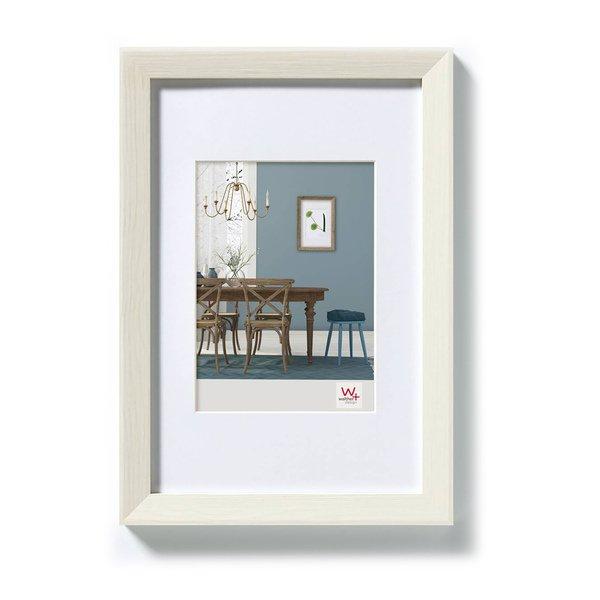 Cadre en bois Fiorito avec profilé MDF descendant vers l'intérieur, veiné, surface filmée, avec passe-partout biseauté. Verre : verre clair lavé. Panneau arrière : fibres dures, avec support. Système de suspension : Œillets pour une suspension en format vertical ou horizontal. Fermeture : Flexpins