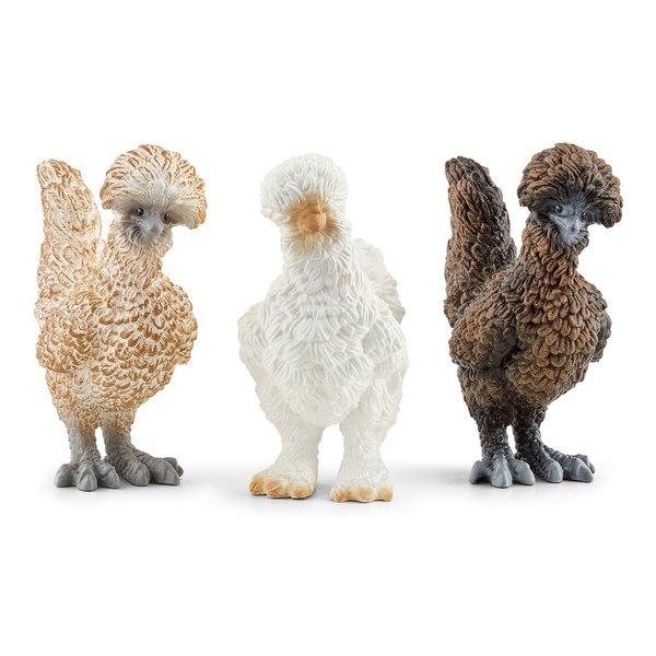 Cot, cot, cot, codac ! Voici le trio de poules ! Ces trois amies aux belles plumes picorent, picorent, picorent sur le chemin jusqu’à l’univers schleich® FARM WORLD à la demande générale. Comprend deux Hollandaises Huppées et une Poule Soie.