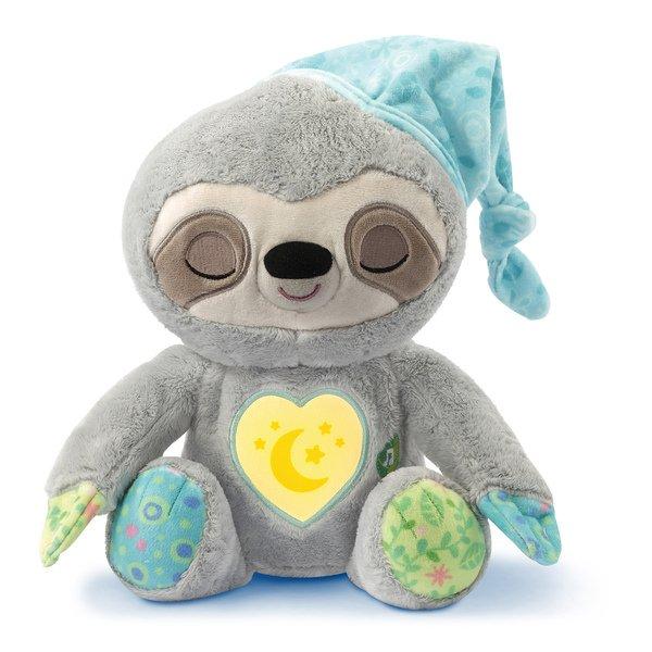 Mit dem lustigen Faultier schlummern und spielen! Niedliches Faultier aus Plüsch, das mit sanften Bewegungen und Geräuschen beim Einschlafen hilft. Macht süsse Atem- und Schnarchgeräusche und bewegt dabei den Kopf. Mit leuchtender Herztaste (Nachtlicht) auf dem Bauch. 3 Modi: 3 Schlaflieder und 25 Melodien (ca. 45 Minuten), 17 Natur- und Alltagsgeräusche (z. B. Meeresrauschen, Grillenzirpen, Wasserfall, Wal- gesänge, Vogelzwitschern, Atmen, Fön), 5 Gedichte und Reime. Musiktaste, um nächstes Lied/Geräusch zu wählen. Geräuschsensor lässt die Melodien erneut erklingen, sobald das Baby weint. Zeitschaltuhr für automatisches Abschalten nach 30 oder 45 Minuten. Das elektronische Modul befindet sich im Inneren des Spielzeugs (nicht herausnehmbar). Plüsch lässt sich mit einem leicht feuchten Tuch reinigen. Lautstärkeregler sowie Schalter zur Auswahl des Soundmodus am Modul. Kindersicheres Batteriefach und Abschaltautomatik. Demobatterien sind enthalten.