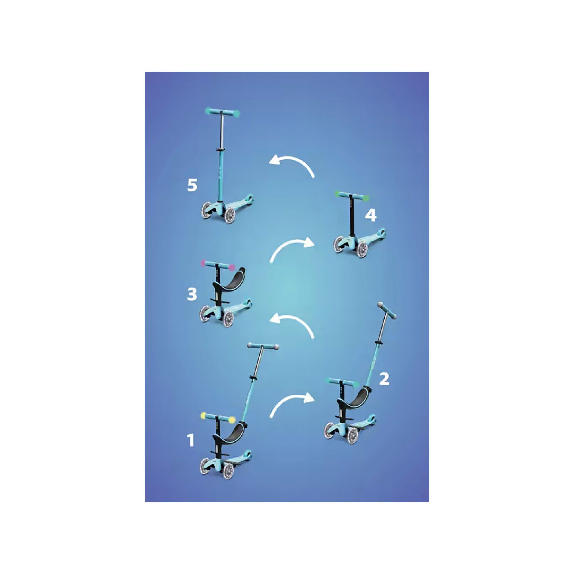 Le Micro Mini2Grow Deluxe Magic LED est le compagnon idéal pour les premières années de ta progéniture. Grâce à sa multifonctionnalité, elle peut être utilisée dès l'âge de 12 mois et accompagnera ton enfant jusqu'à ses six ans au moins. La trottinette tout-en-un innovante et ergonomique peut être utilisée de différentes manières : tout d'abord avec un siège, deux options de cale-pieds et une barre de poussée pour les parents, ensuite avec un siège sans barre de poussée, comme un mélange entre une roue et une trottinette et enfin comme une Mini Micro Deluxe classique avec des boules lumineuses Magic LED sur le guidon et des roues LED Moon. La barre de poussée pour les parents peut être utilisée verticalement en plus de la position horizontale standard. Ainsi, une seule main est nécessaire pour pousser, ce qui ménage le poignet et les muscles. En outre, le Micro Mini2Grow Deluxe Magic LED convainc par son guidon réglable en hauteur, son mécanisme breveté lean-to-steer et son marchepied extra antidérapant.