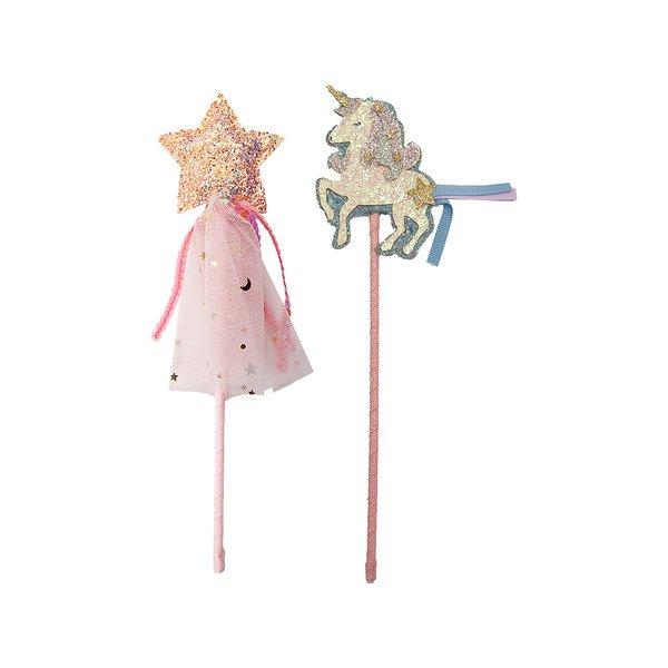 Les enfants adoreront ce set de deux baguettes magiques, une licorne et une étoile filante. Les deux baguettes sont entourées d'un joli ruban rose scintillant.