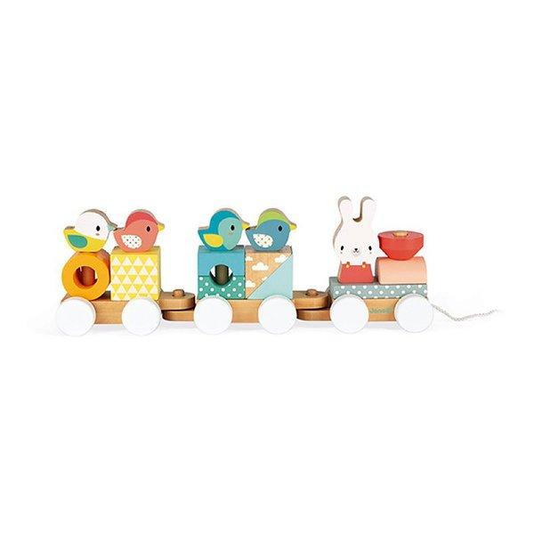 Un train à promener avec 14 cubes. Le lapin et les 4 oiseaus voyagent volontiers en ton train, si tu le tires derrière toi-même.