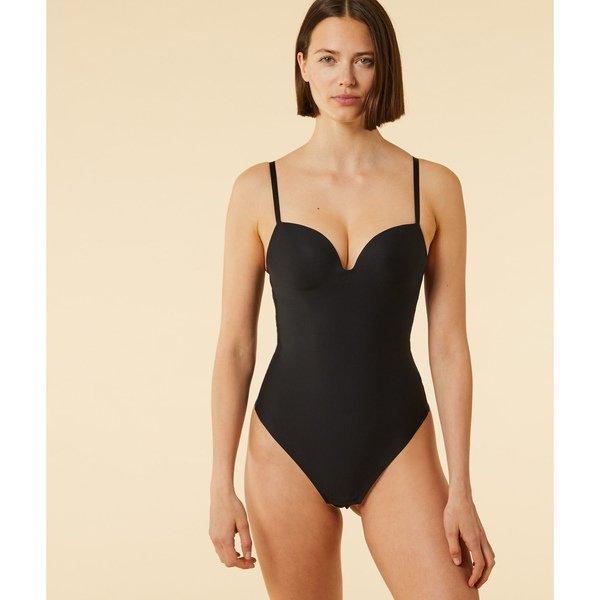 Ce body offre une silhouette lisse et sans couture, parfait pour être porté sous diverses tenues. Le design présente un décolleté en V profond et des bretelles réglables pour un ajustement confortable et personnalisable. Son esthétique minimaliste assure une polyvalence pour un usage quotidien ou des occasions spéciales.