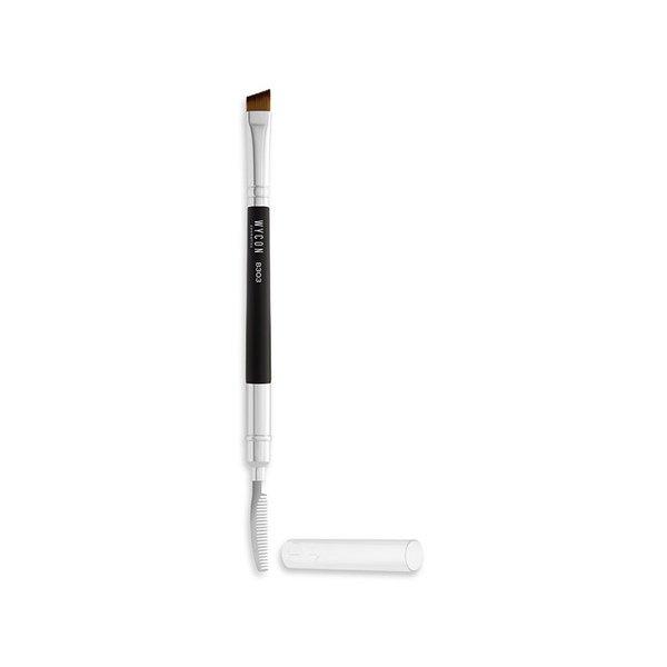 Double brosse à sourcils. D’un côté, une brosse à poils denses pour prélever et appliquer le produit et de l’autre, une brosse en métal innovante pour peigner et fixer. La brosse inclinée vous permet de définir les sourcils d’un trait précis et de les dessiner poil par poil avec un effet de remplissage parfait.