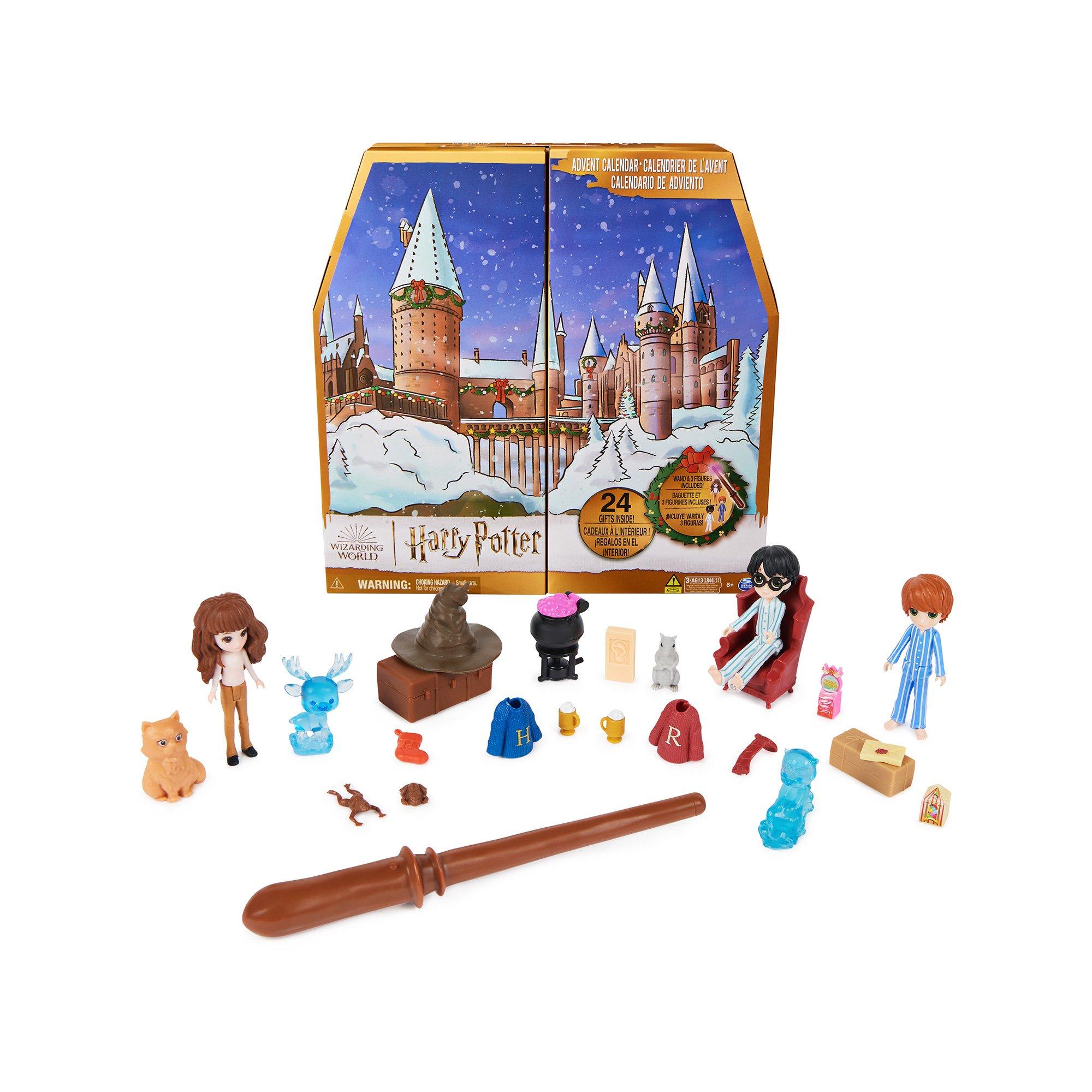 Décomptez les jours avant les fêtes avec le calendrier de l'avent Magical Minis de Wizarding World. Contenant 24 cadeaux, ce calendrier enchanteur est le moyen idéal d'attendre Noël pour les sorcières, sorciers et Moldus. Déballez une surprise par jour, en commençant par la première porte : une baguette magique Harry Potter avec lumière UV (3 piles LR44 fournies). Utilisez la lumière de la baguette pour fouiller les salles communes de Poudlard et révéler les nombres cachés sur le calendrier. Découvrez trois figurines exclusives Magical Minis de 7,6 cm de Harry Potter et Ron Weasley portant leur pyjama rayé et de Hermione Granger portant un pull rose, et plus de 20 accessoires dont les pulls de Noël « H » et « R », une écharpe pour la poupée Hermione, Hedwige, le Choixpeau magique, la Cape d'Invisibilité et bien plus encore. Après avoir découvert toutes les surprises du calendrier, le décor de Poudlard sur le thème des fêtes de fin d'année représente un cadre parfait pour les aventures et les jeux de rôles de Wizarding World. Étoffez votre collection avec toutes les poupées Harry Potter Magical Minis et les coffrets de poupées (petites poupées et coffrets vendus séparément). Les jouets Harry Potter Wizarding World sont des cadeaux incontournables pour les enfants et les fans qui aiment les objets à collectionner, les baguettes magiques, les figurines articulées, les poupées et leurs accessoires. Ils constituent des cadeaux parfaits pour les anniversaires ou pour les fêtes. Rendez le compte à rebours avant les fêtes encore plus magique avec le calendrier de l'avent Magical Minis de Wizarding World.\n\nContenu : 1 baguette magique, 3 figurines, 23 accessoires, 1 mode d'emploi