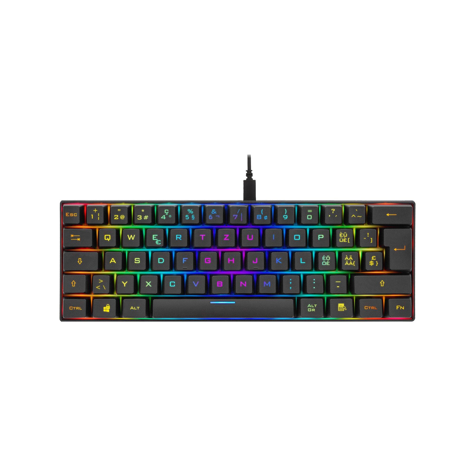 Ce clavier dispose de commutateurs RGB bruns, d'une disposition nordique ISO, mais d'une conception à 60%, c'est-à-dire de 62e touches seulement. La barre d'espacement n'utilise pas de cavalier, mais elle est enfoncée tout droit, que l'on appuie au milieu ou sur le côté de la touche. Le clavier dispose d'un total de 19 modes d'éclairage (réglages logiciels non inclus). La plupart des positions de couleur peuvent être modifiées avec (FN +.). Vous pouvez également modifier la vitesse ou l'intensité lumineuse pour les différents modes. Lorsqu'un mode de vitesse ou d'intensité atteint la position la plus basse / la plus haute, le clavier clignote avec la touche de verrouillage et la touche Windows.