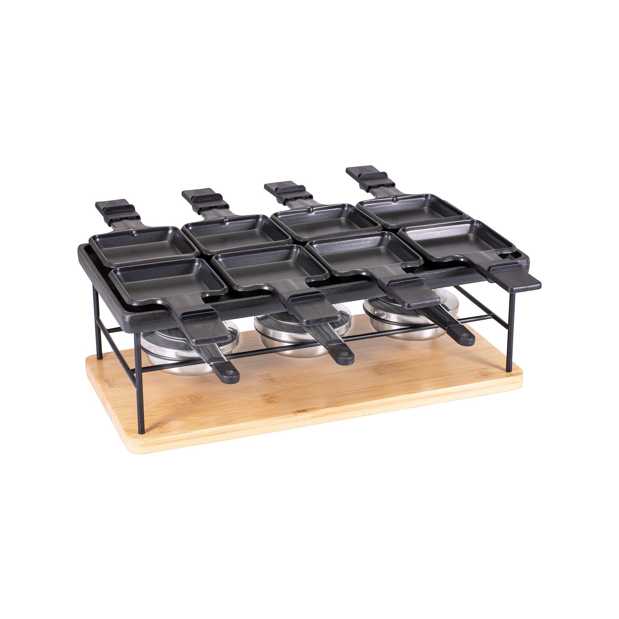 Grâce à son plateau réversible, le four à raclette multifonctionnel de Kadastar peut être utilisé pour le gril de table, la raclette, la fondue ou comme plaque chauffante. Il est livré avec 8 poêlons à raclette et les spatules à raclette correspondantes. Grâce aux trois brûleurs à pâte, le four à raclette fonctionne entièrement sans électricité.