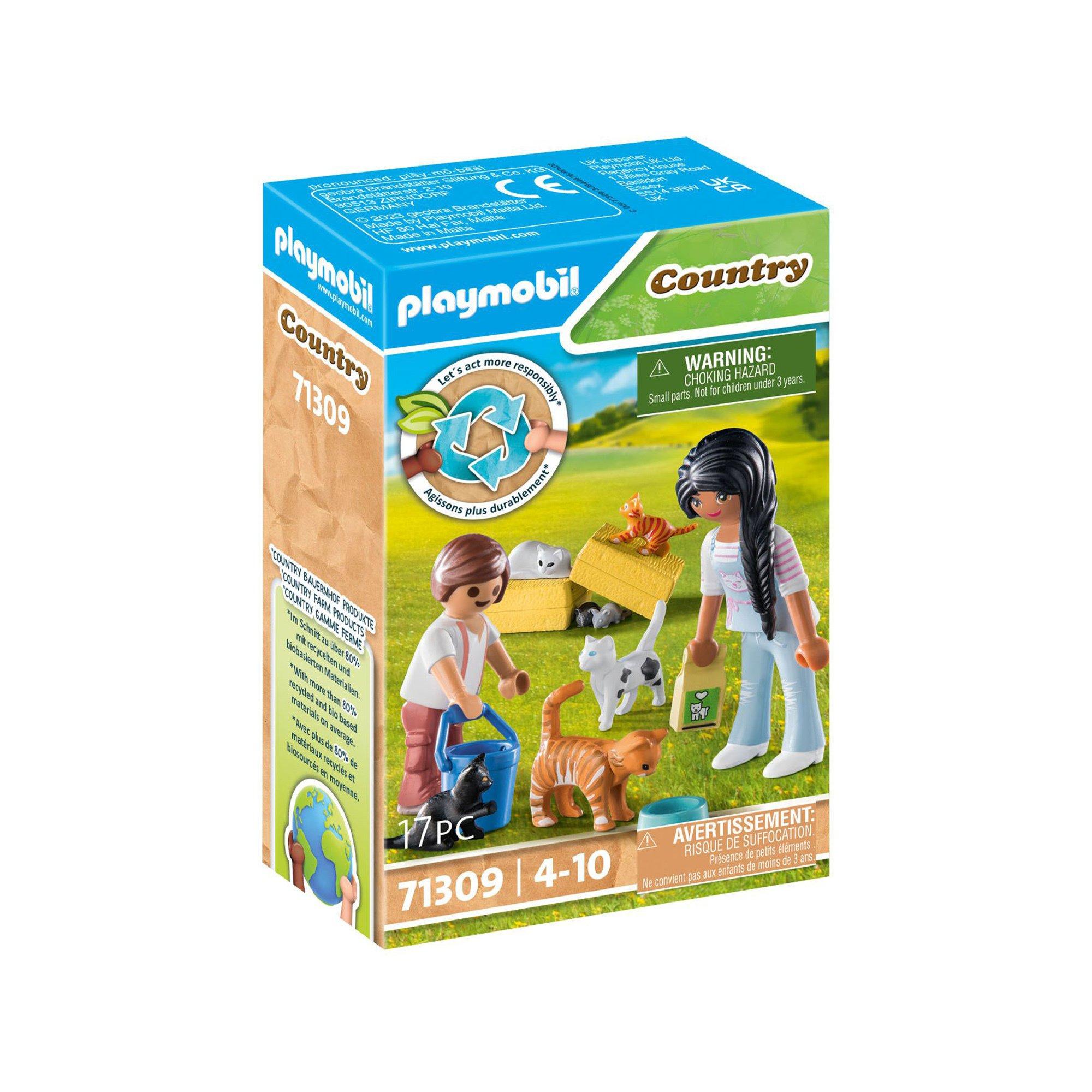 Le set de 17 figurines contient deux figurines PLAYMOBIL, trois chats, deux chatons, deux souris et d'autres extras.