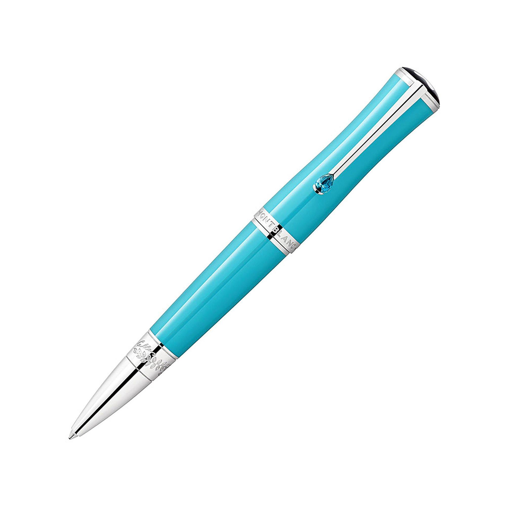 Cette édition met en avant la couleur turquoise, l’une de ses préférées, qui se retrouve dans la résine précieuse du capuchon et du corps, tout en rappelant la beauté gracieuse de Maria Callas par son élégante silhouette fine. En hommage à sa terre natale, la Grèce, et à la mer qui l’entoure, l’agrafe platinée est décorée d’une pierre dont la couleur n’est pas sans rappeler la beauté du bleu turquoise de la mer Égée. Détail tiré du costume de l’un de ses rôles de bel canto les plus célèbres, dans « Norma » de Bellini, le cône platiné de l’instrument d'écriture est couronné de feuilles de laurier et orné de la signature gravée de la célèbre soprano.