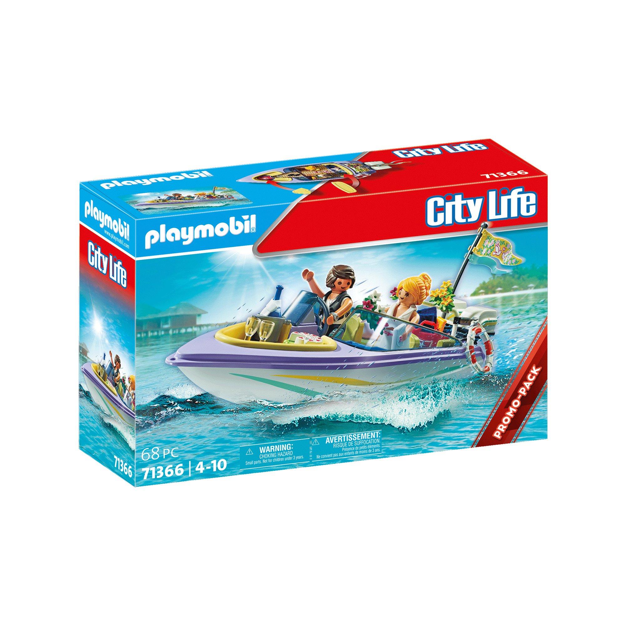 Après la cérémonie de mariage romantique, les jeunes amoureux partent en voyage de noces. Pour cela, ils ont loué un bateau à moteur. Ils s'élancent en mer et font d'abord une pause. Les jeunes mariés s'assoient sur le pont soleil et profitent du temps magnifique. Ensuite, ils enfilent leur maillot de bain et se jettent à l'eau. Cette lune de miel va être merveilleuse ! Le set de jeu Lune de miel PLAYMOBIL invite les garçons et les filles de 4 ans et plus à des heures de jeu romantiques.