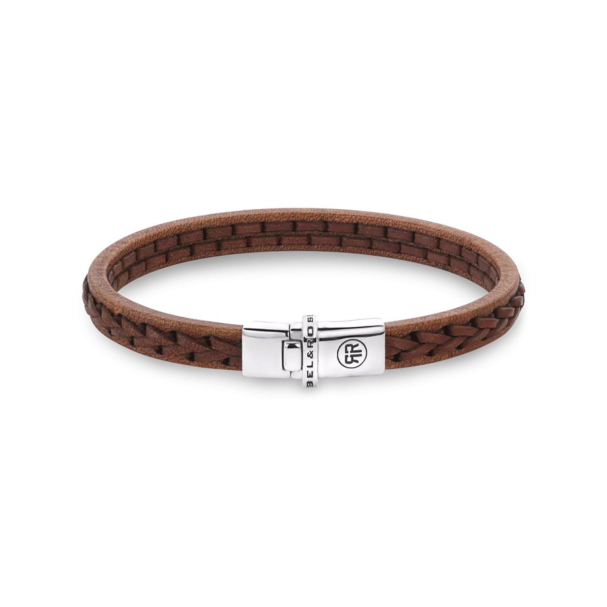 Le bracelet Single Stranded de Rebel and Rose est un bracelet fabriqué à la main avec un fermoir en argent complet. Le cuir marron a une largeur de 7,5 mm et un motif est crocheté sur la sangle. L'intérieur de la sangle est lisse, ce qui assure un confort de port parfait.
