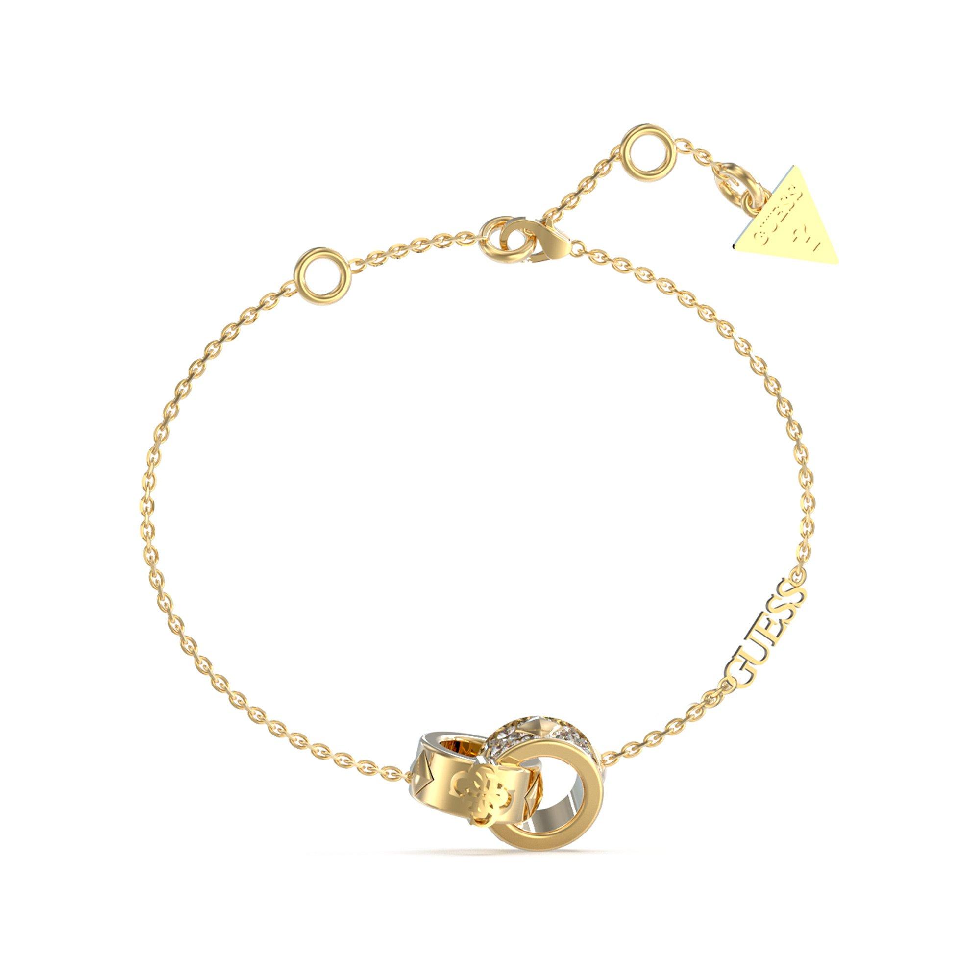 Bracelet pour femme de couleur dorée en acier inoxydable avec un fermoir mousqueton. La longueur totale est de 18,5 cm (15 cm + 3,5 cm réglables). Décoré de pierres précieuses de zirconium étincelantes, ce bracelet offre une touche d’élégance et de style.