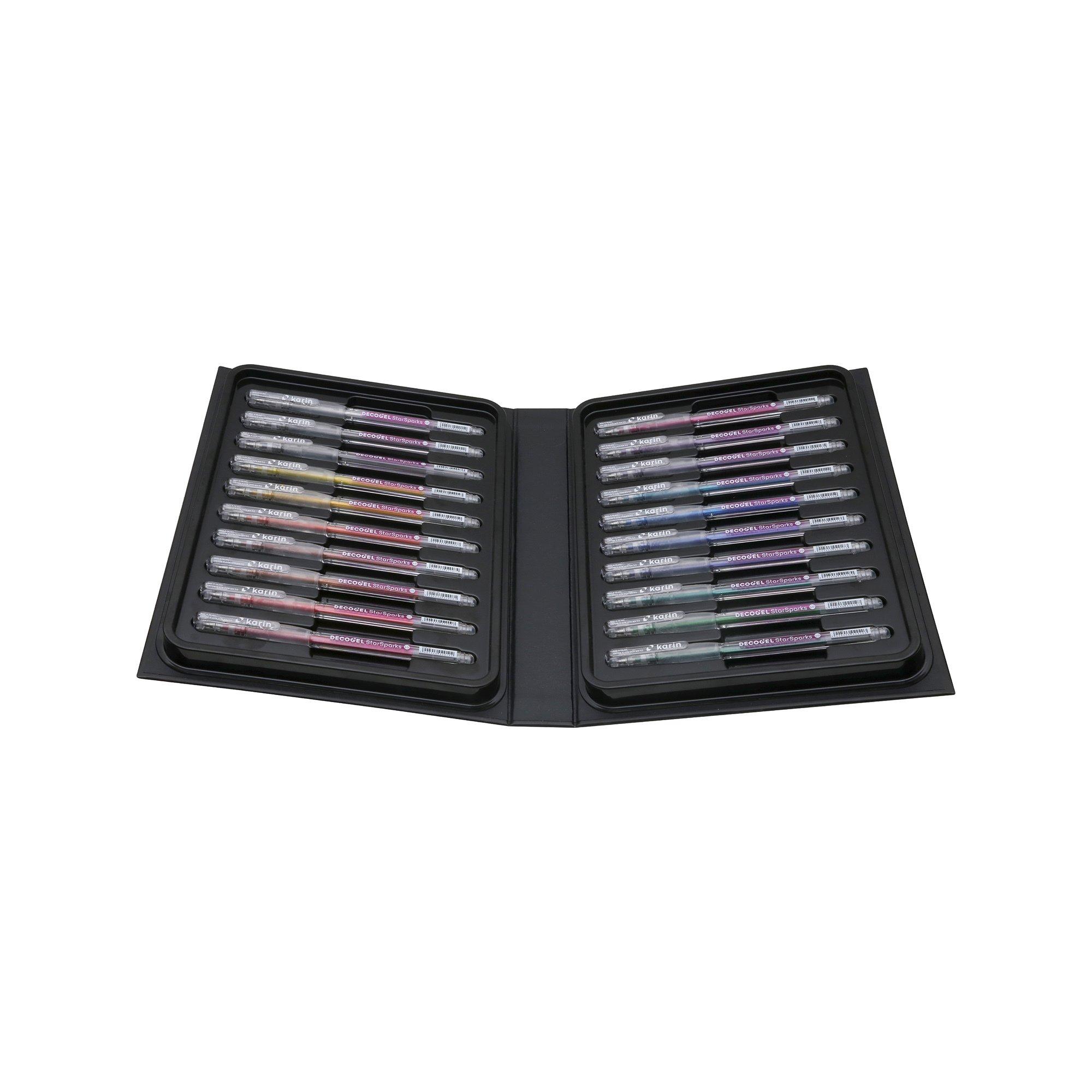 DECO GEL 1.0 est une collection de 50 crayons gel pour la décoration, le dessin et la calligraphie, répartis en séries de couleurs : MILKY WAY, METALLIC et STAR SPARKS. Ils fonctionnent parfaitement sur les surfaces de papier claires et foncées ainsi que sur les papiers peints à l'aquarelle, les marqueurs à base d'eau (comme les marqueurs Brushmarker PRO) et de nombreuses autres surfaces comme le verre, le film, le métal ou la pierre avec des peintures acryliques et des marqueurs contenant des peintures acryliques (comme les marqueurs Pigment Decobrush). Cette diversité de surfaces offre des possibilités créatives illimitées.