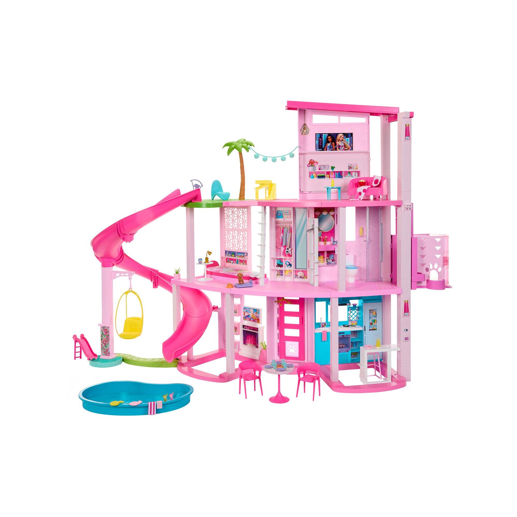 Les enfants peuvent organiser l'ultime fête de la piscine avec la villa de rêve de Barbie. Pour s'amuser sans fin au soleil, cette maison de poupées de luxe possède le plus long toboggan de la série Villa de Rêve de Barbie à ce jour, un toboggan en spirale qui descend sur trois étages. Elle offre des possibilités de jeu à tous les niveaux avec un espace généreux et spacieux, trois étages et 10 zones de jeu intérieures et extérieures. Cet ensemble de jeu est également plus que jamais adapté aux animaux domestiques, avec notamment un toboggan pour les toutous et une piscine dans laquelle les amis à fourrure peuvent jouer avec la poupée Barbie. La pièce bonus à l'étage supérieur est également très intéressante avec une possibilité de transformation pour une soirée pyjama où quatre poupées peuvent dormir dans la villa de rêve. Avec plus de 75 accessoires et des zones transformables pour doubler le plaisir, c'est un excellent cadeau pour les enfants de 3 ans et plus. Assemblage nécessaire. Poupées non incluses. Sous réserve de variations de couleur et de conception.