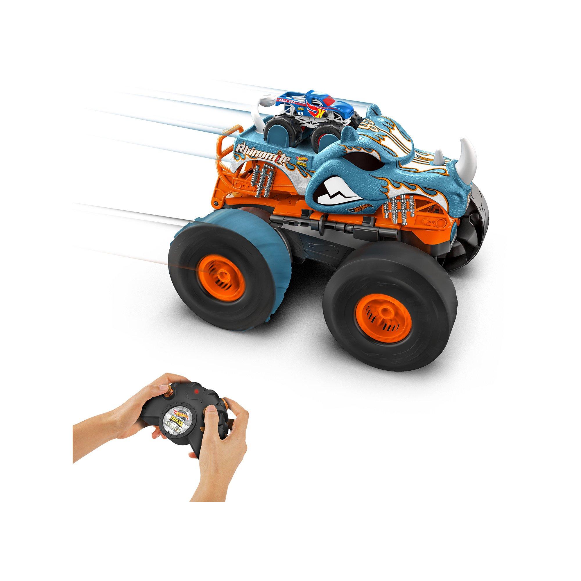 Les accidents, les cascades et les manœuvres d'accélération ne manquent pas avec le Rhinomite transformable télécommandé Hot Wheels Monster Trucks HW ! Ce Monster Truck télécommandé à l'échelle 1:12 dispose d'énormes roues, de décorations authentiques et du mode dynamite. Le grand Monster Truck peut être transformé en accélérateur motorisé pour les Monster Trucks plus petits à l'échelle 1:64. Il peut les propulser dans les airs jusqu'à une hauteur d'environ 90 cm ! Un Race Ace à l'échelle 1:64 est inclus dans la livraison : Il peut être conservé sur le plateau de chargement du plus grand camion pendant le jeu télécommandé, puis démarré par l'accélérateur après la grande transformation. On peut ainsi réussir des figures cool comme des 360 wheelies et des vitesses allant jusqu'à 10 km/h. Sous réserve de variations de couleur et de conception.