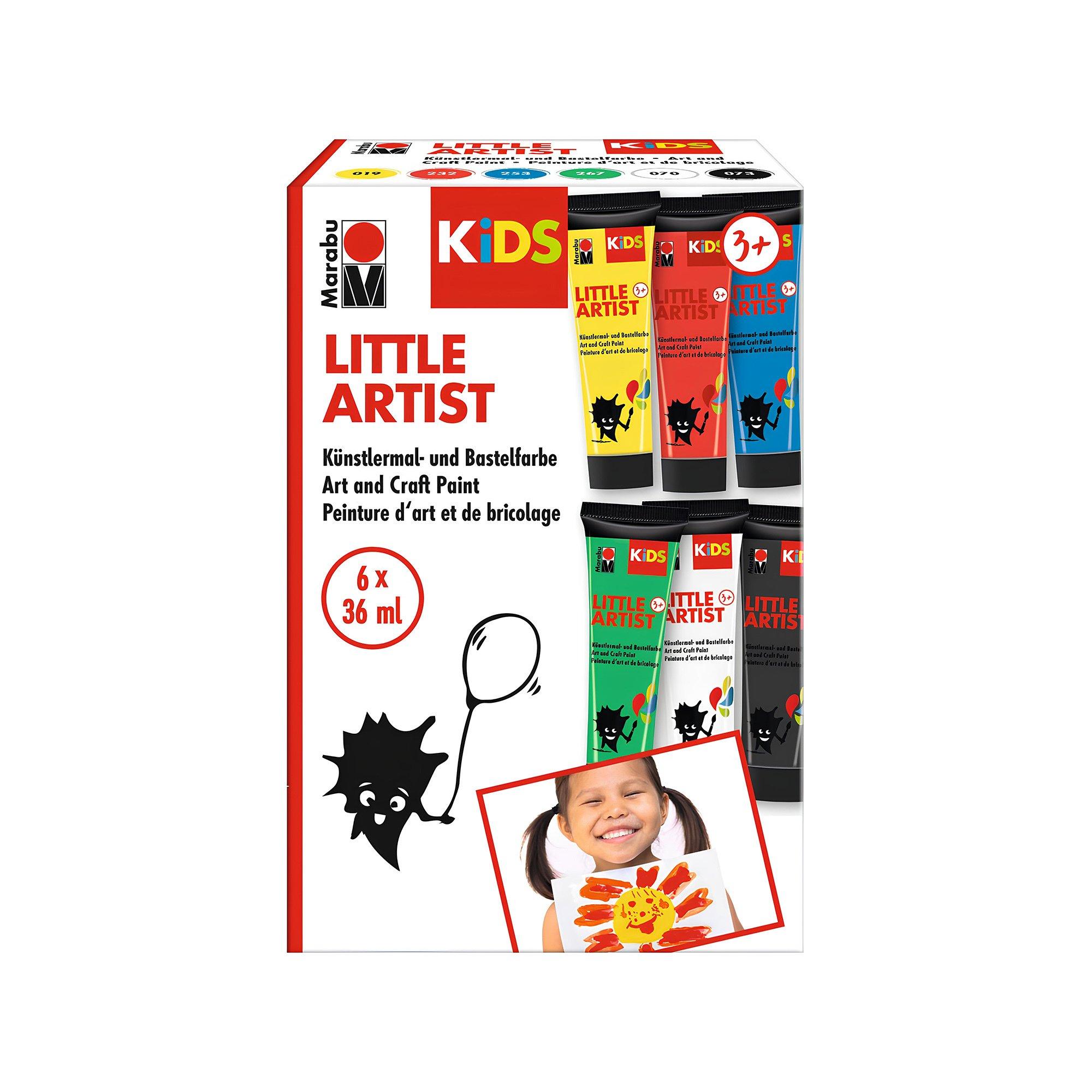 Marabu KiDS peinture pour bricolage Little Artist, 36 ml, set de 6 tubes, couleur intense et lumineuse, bon pouvoir couvrant, crémeux, facile à colorier, séchage rapide, lavable, peinture pour artistes et bricolage.