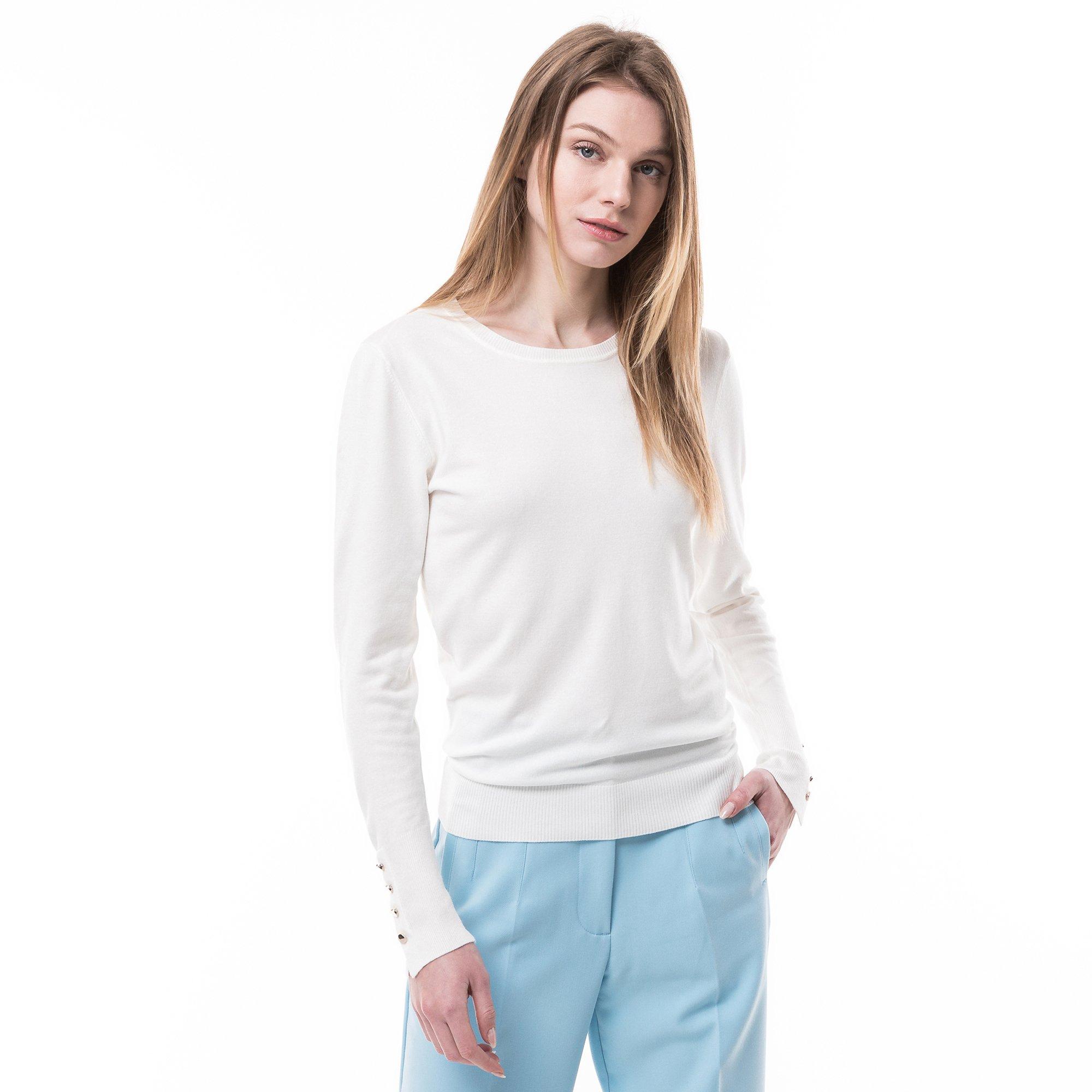 Ce pull à manches longues présente un col rond classique, offrant un ajout polyvalent à toute garde-robe. Le design comprend des boutons décoratifs aux poignets, ajoutant une touche d'élégance au vêtement.