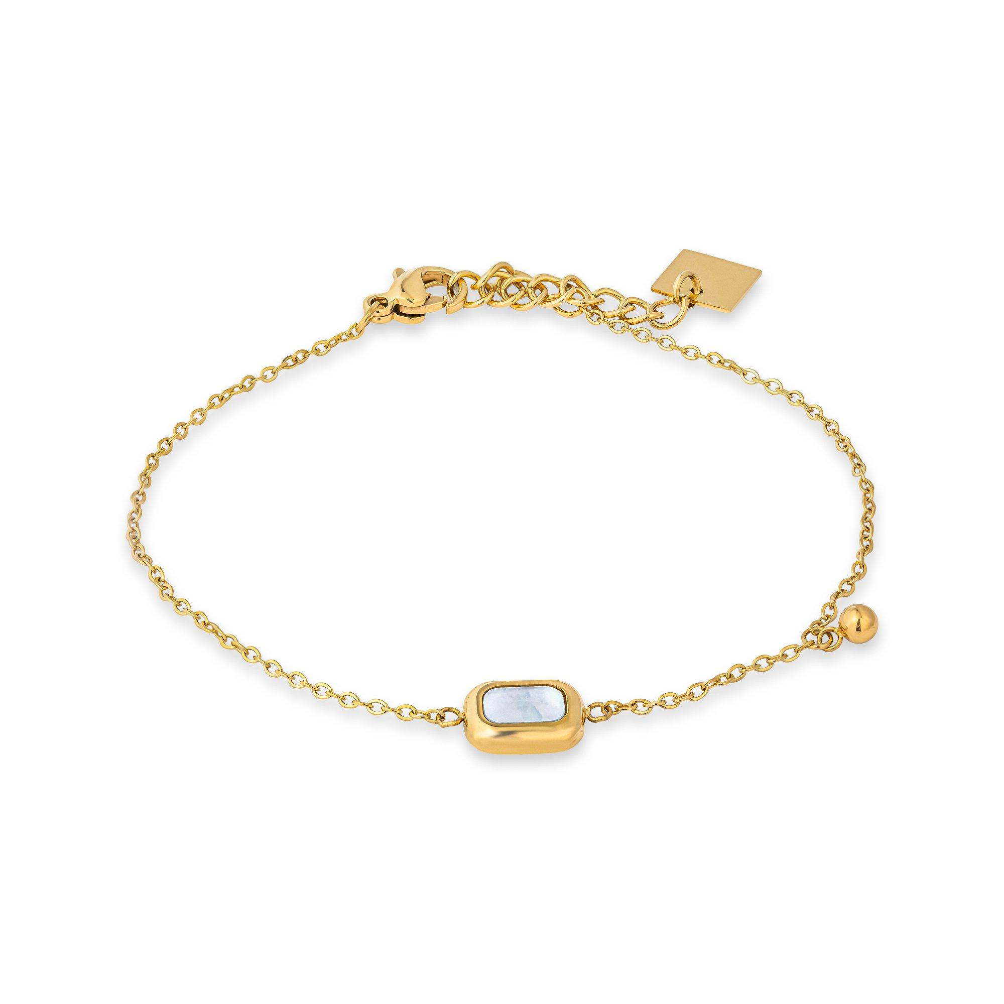 Ce bracelet fin de Zag Bijoux est en acier inoxydable poli doré. La chaîne réglable en longueur porte au milieu un pendentif en nacre angulaire et un petit charme sphérique.