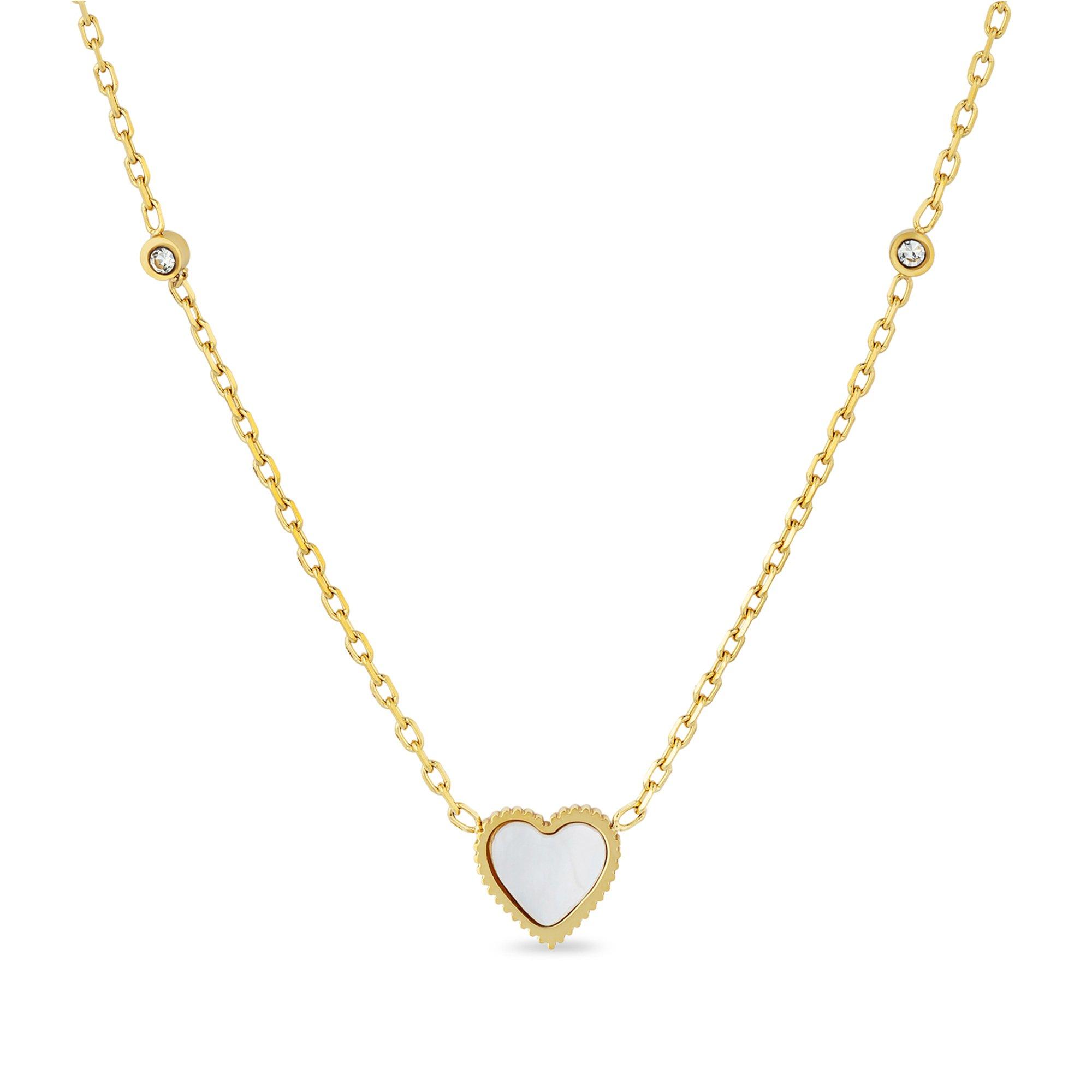 Ce collier filigrane de Zag Bijoux est en acier inoxydable doré. Le centre forme un cœur recouvert de nacre, librement mobile. De minuscules pierres décoratives le long de la chaîne soulignent la finesse du bijou. La chaîne est fermée par un mousqueton et est réglable en longueur.