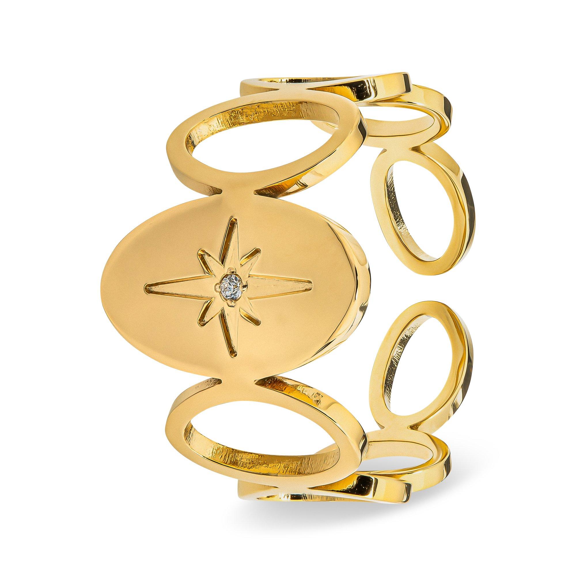 Cette bague de Zag Bijoux est en acier poli. Le design féminin avec un rail annulaire ouvert en ovales alignés et une plaque centrale en forme d'étoile gravée et une pierre décorative incrustée est remarquablement harmonieux.