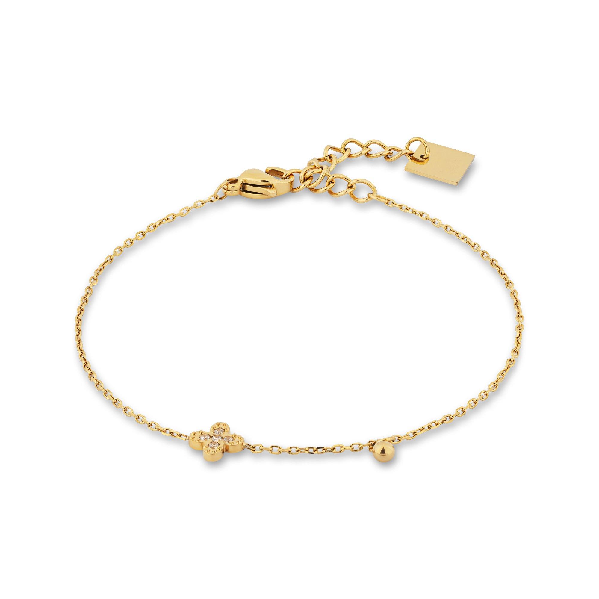 Ce bracelet de Zag Bijoux en acier inoxydable poli avec une finition or est composé d'une chaîne à maillons en filigrane avec une forme de fleur stylisée au centre qui est sertie de pierres décoratives. Le charmant bracelet a une allure enjouée. Il est réglable en longueur et peut être fermé par un fermoir à mousqueton avec un charme de logo.