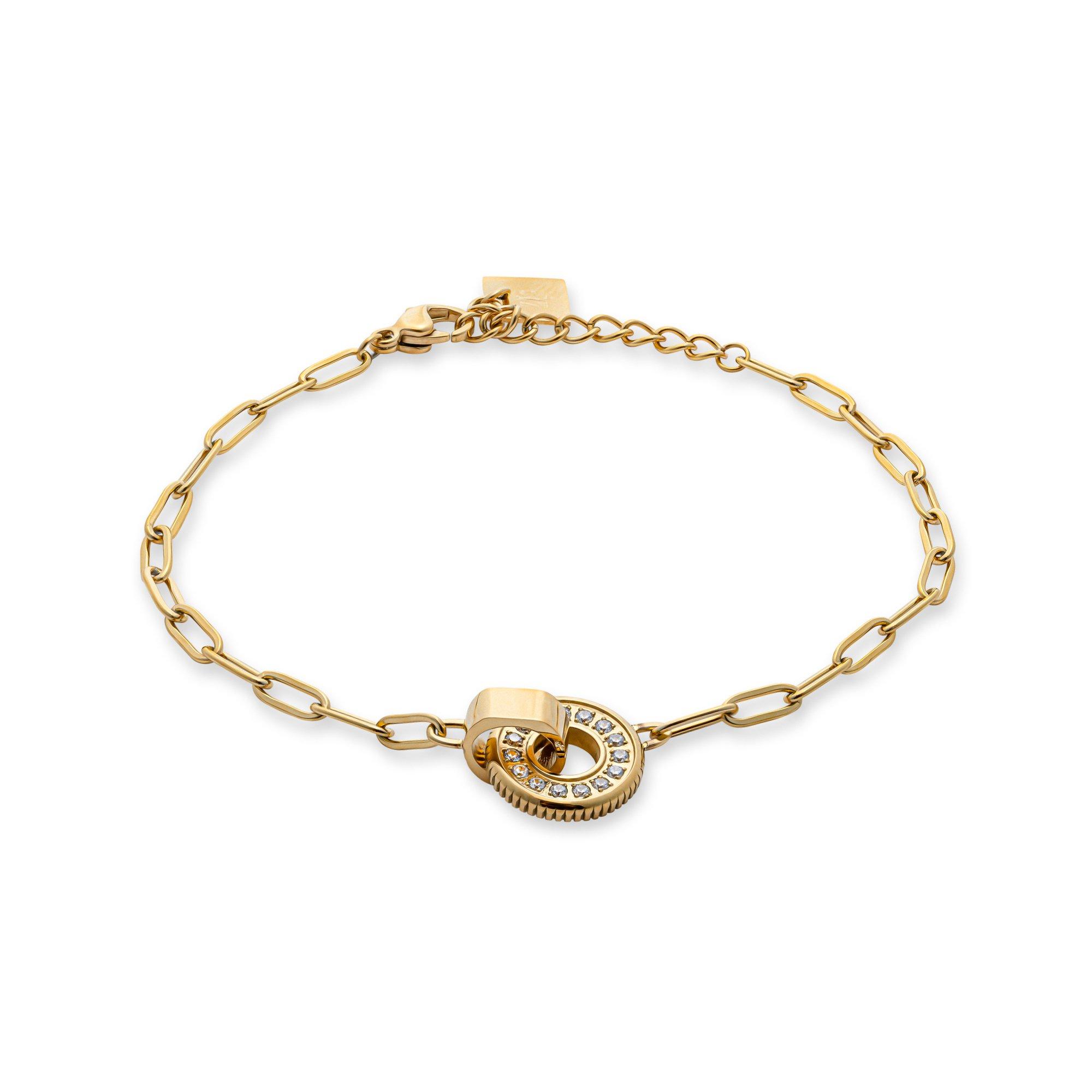 Ce bracelet de Zag Bijoux est composé d'une chaîne à maillons grossièrement conçue en acier inoxydable poli avec une finition en or. Le design moderne avec des formes imbriquées au centre, dont l'une est sertie de pierres décoratives, combine des éléments classiques et modernes dans un style intemporel et élégant.