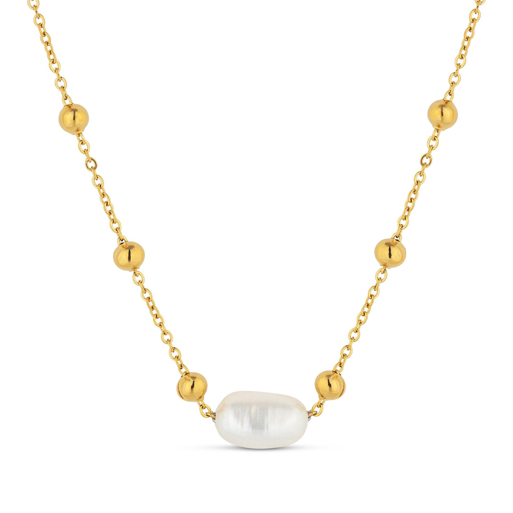 Ce collier filigrane de Zag Bijoux est en acier inoxydable doré. Le centre forme une perle allongée en nacre. De fines boules le long de la chaîne soulignent l'élégance du bijou. La chaîne est fermée par un mousqueton avec un pendentif de l'étiquette.