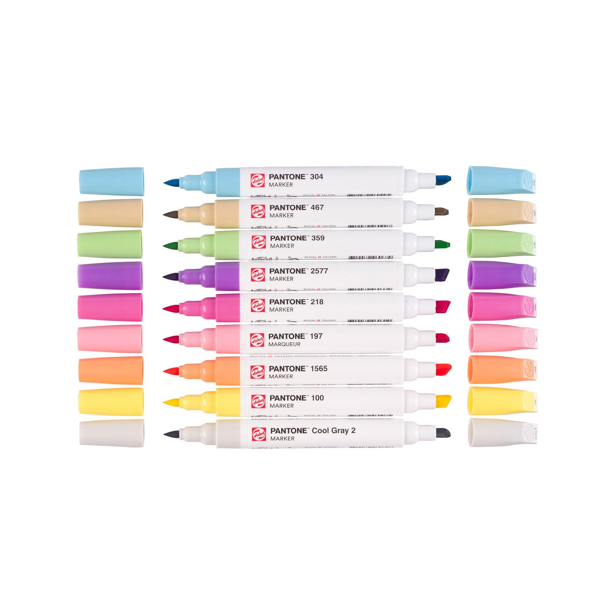 Esquissez, dessinez et créez avec les marqueurs Pantone de Talens dans les couleurs Pantone ! Ces marqueurs de haute qualité sont basés sur le Pantone Matching System et contiennent de l'encre pigmentée à base d'eau dans des couleurs vives. Soigneusement formulés, adaptés et testés par Talens, co-créés et approuvés par Pantone. Ce set contient 9 marqueurs Talens Pantone et est livré dans un coffret robuste au design horizontal élégant, de sorte que vos marqueurs soient toujours prêts à l'emploi et que l'encre s'écoule de manière optimale dans les deux pointes. Grâce aux noms et aux numéros des couleurs sur les capuchons des marqueurs, vous avez rapidement la bonne couleur à portée de main pour votre travail. Mettez vos idées en pratique et découvrez toutes les possibilités ! Chaque marqueur possède deux pointes pour une flexibilité ultime : une pointe pinceau pour les détails et les lignes précises, et une pointe biseau pour les traits larges et les blocs de peinture épais. L'encre sèche rapidement et résiste à l'eau une fois sèche, ce qui la rend parfaite pour l'application en couches. Utilisez les marqueurs sur le papier unique Talens Pantone pour une correspondance optimale avec les couleurs Pantone. Si votre marqueur est à court d'encre, il suffit de le remplir avec l'encre pour marqueur de Talens Pantone de la même couleur ! Les deux sont disponibles dans une large palette de 108 couleurs, ce qui vous permet de laisser libre cours à votre créativité.