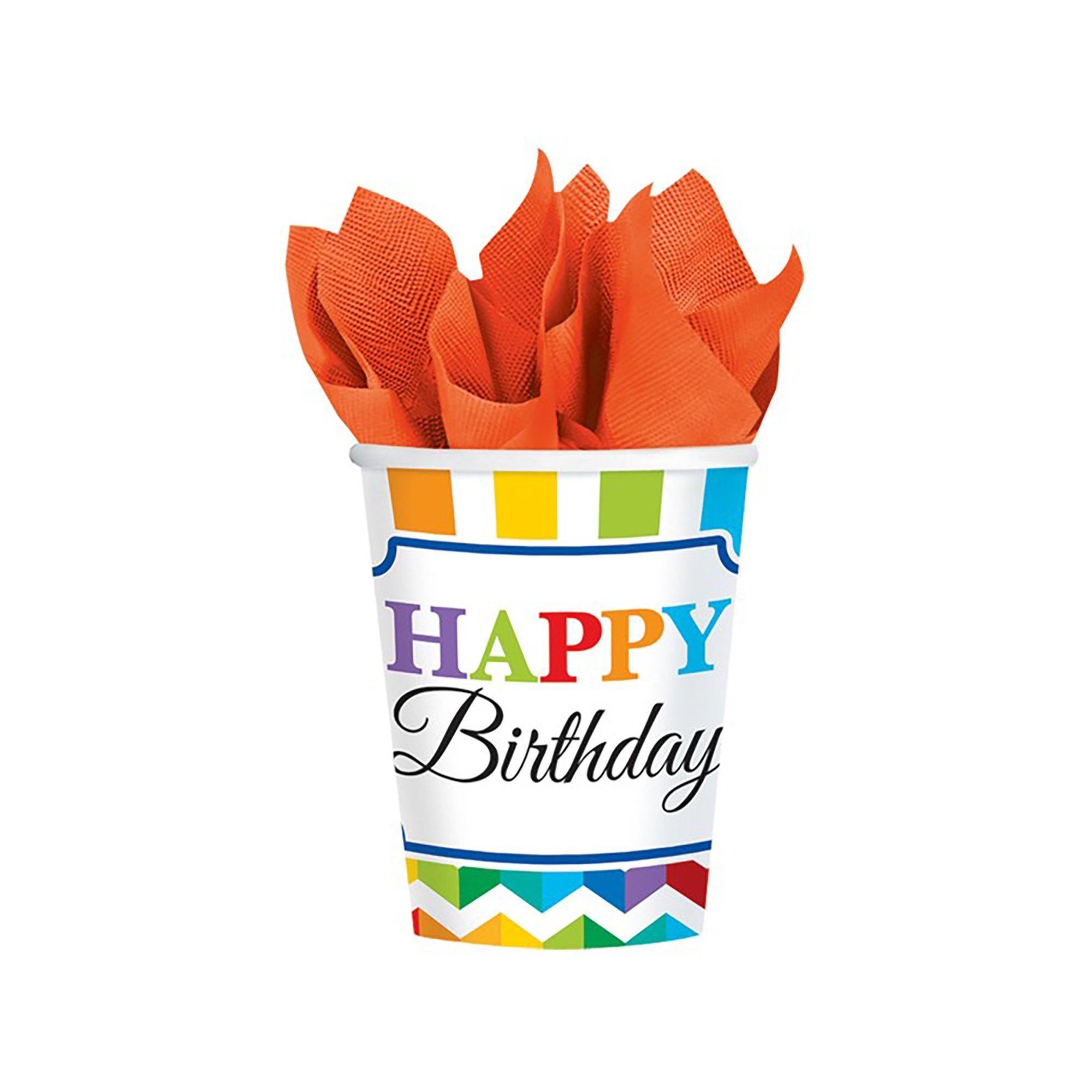 Gobelets en carton 266ml avec motif de Happy Birthday brights. Les gobelets coloré sont la décoration parfaite pour une fête d'anniversaire. Paquet à 8 gobelets.