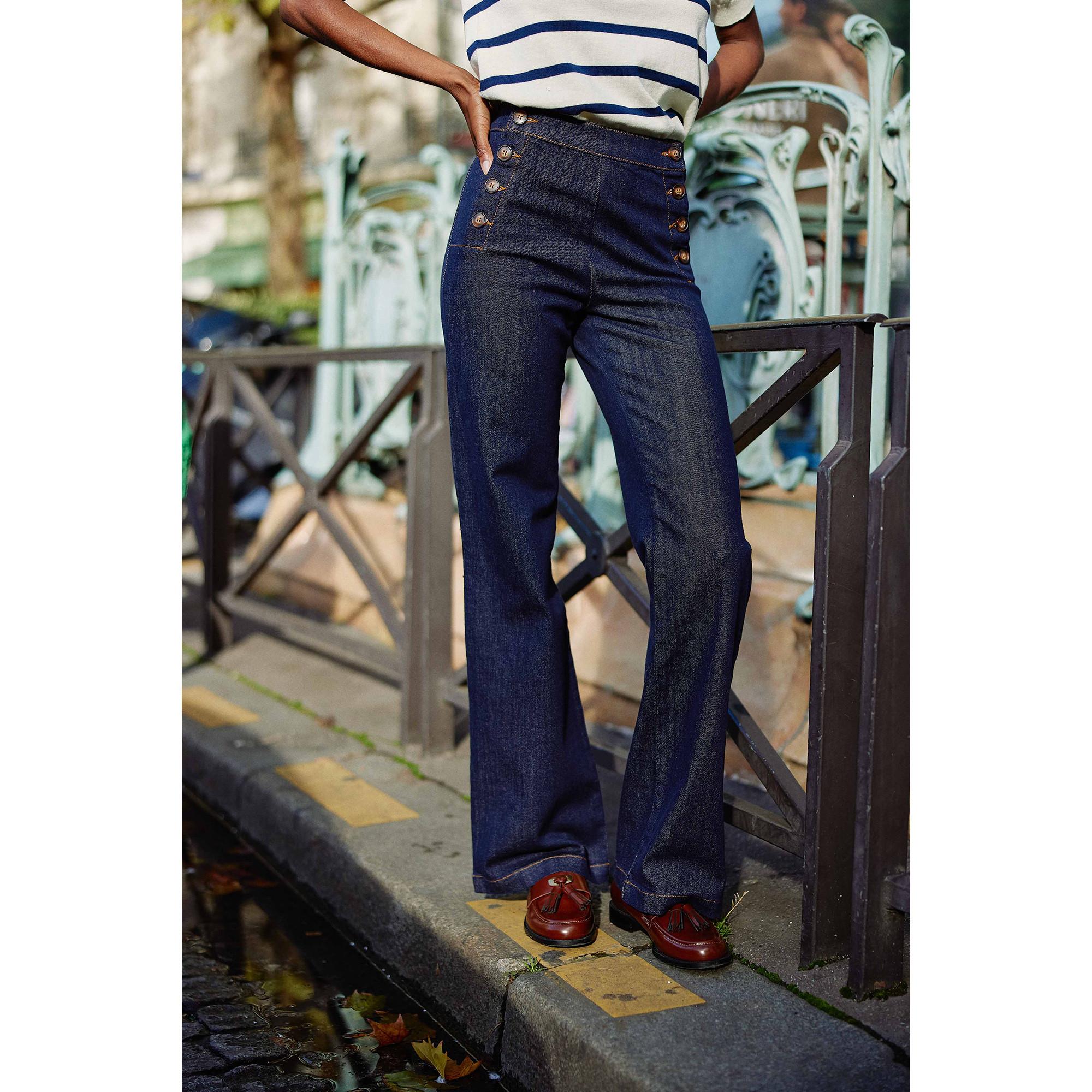 Ce jean flared taille haute offre un look intemporel et tendance. Le design présente une jambe large qui s'évase à partir du genou, créant une silhouette flatteuse. La taille haute assure un ajustement confortable et accentue la silhouette.