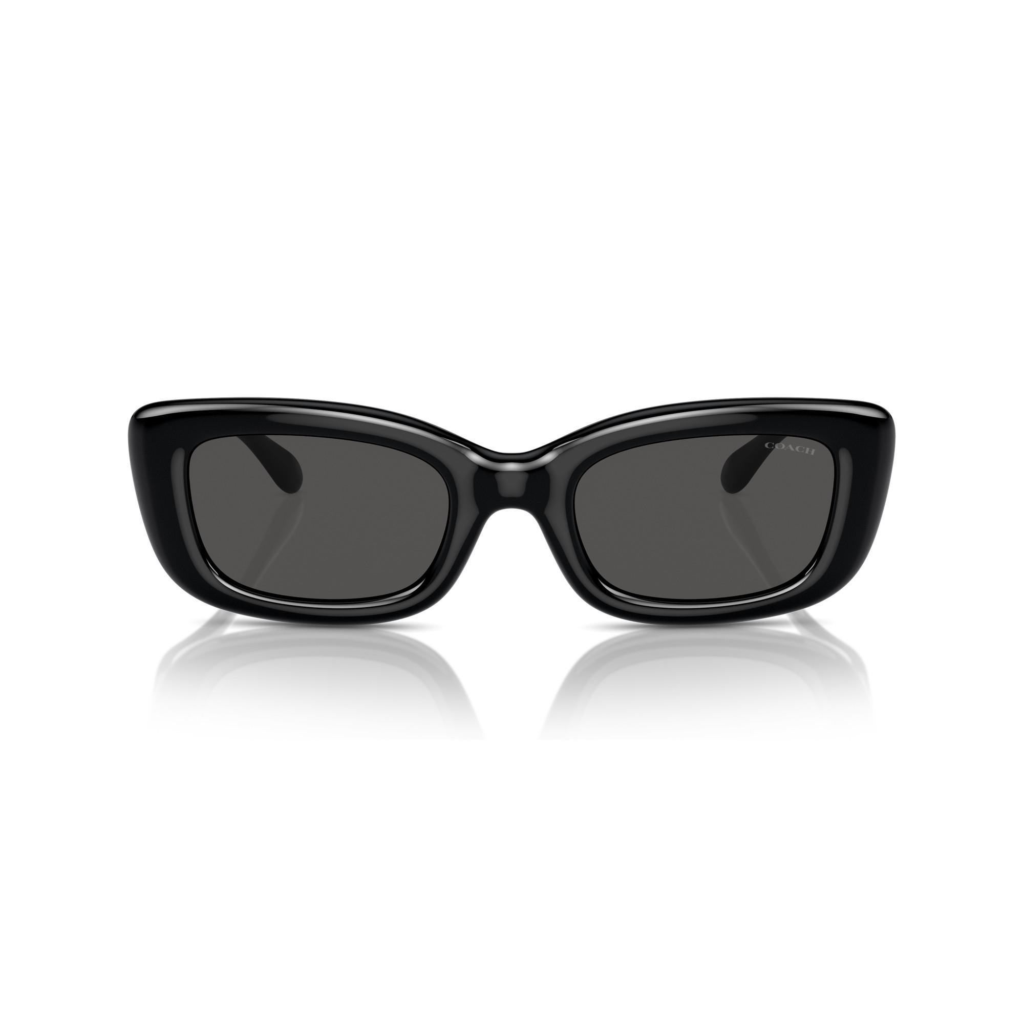 Ces lunettes de soleil Coach présentent un design élégant avec une monture noire et des verres foncés, offrant un accessoire sophistiqué pour diverses occasions. Les branches sont ornées d'un logo 'C' distinctif de couleur or, ajoutant une touche d'élégance et de reconnaissance de la marque.