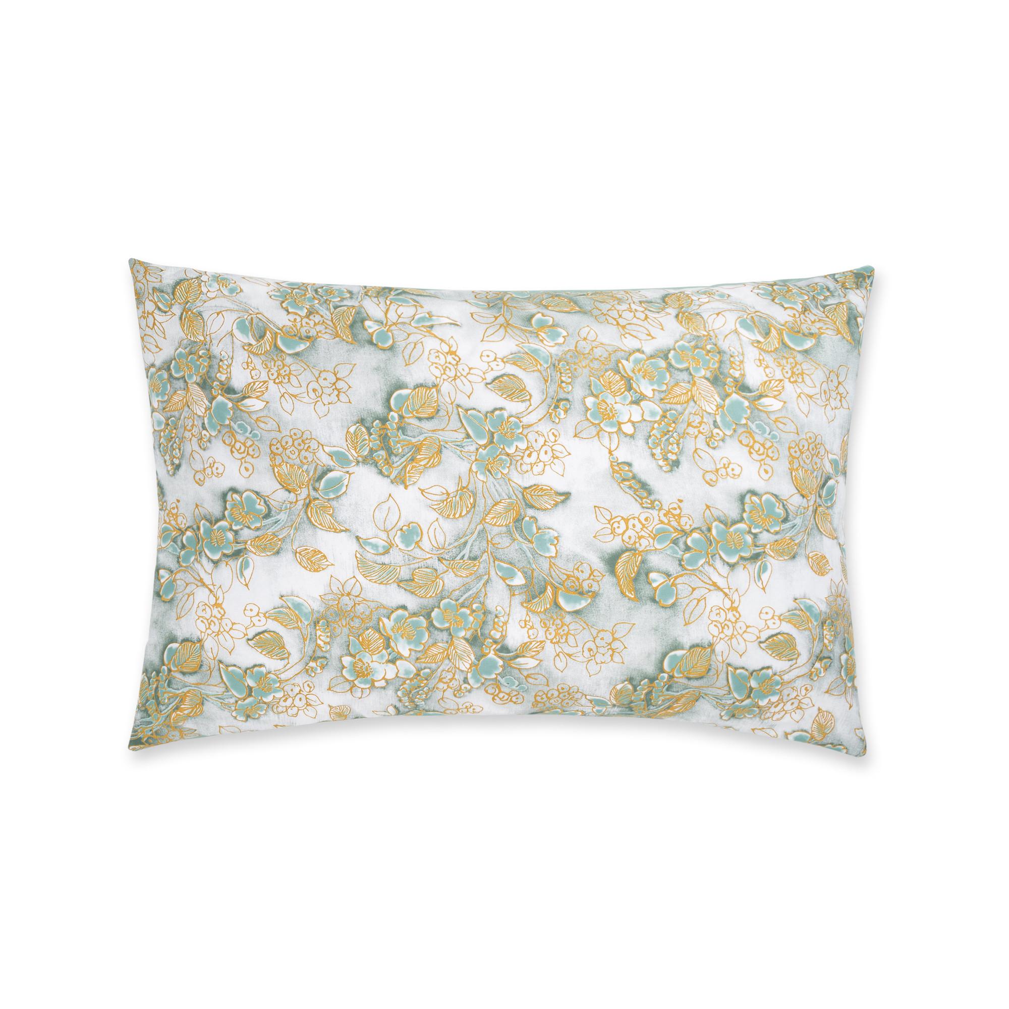 La collection Chinoiserie est animée par la passion pour la céramique orientale qui remplissait la noblesse européenne au 18e siècle. Cette collection est née de longues recherches et expérimentations dans le domaine de l'impression. Le motif floral apparaît sur le fond avec un effet d'aquarelle et devient tridimensionnel grâce au profil floqué et doré. La taie d'oreiller est en satin pur coton 300TC, teint et imprimé avec des pigments gonflants et une pâte métallique écologique.