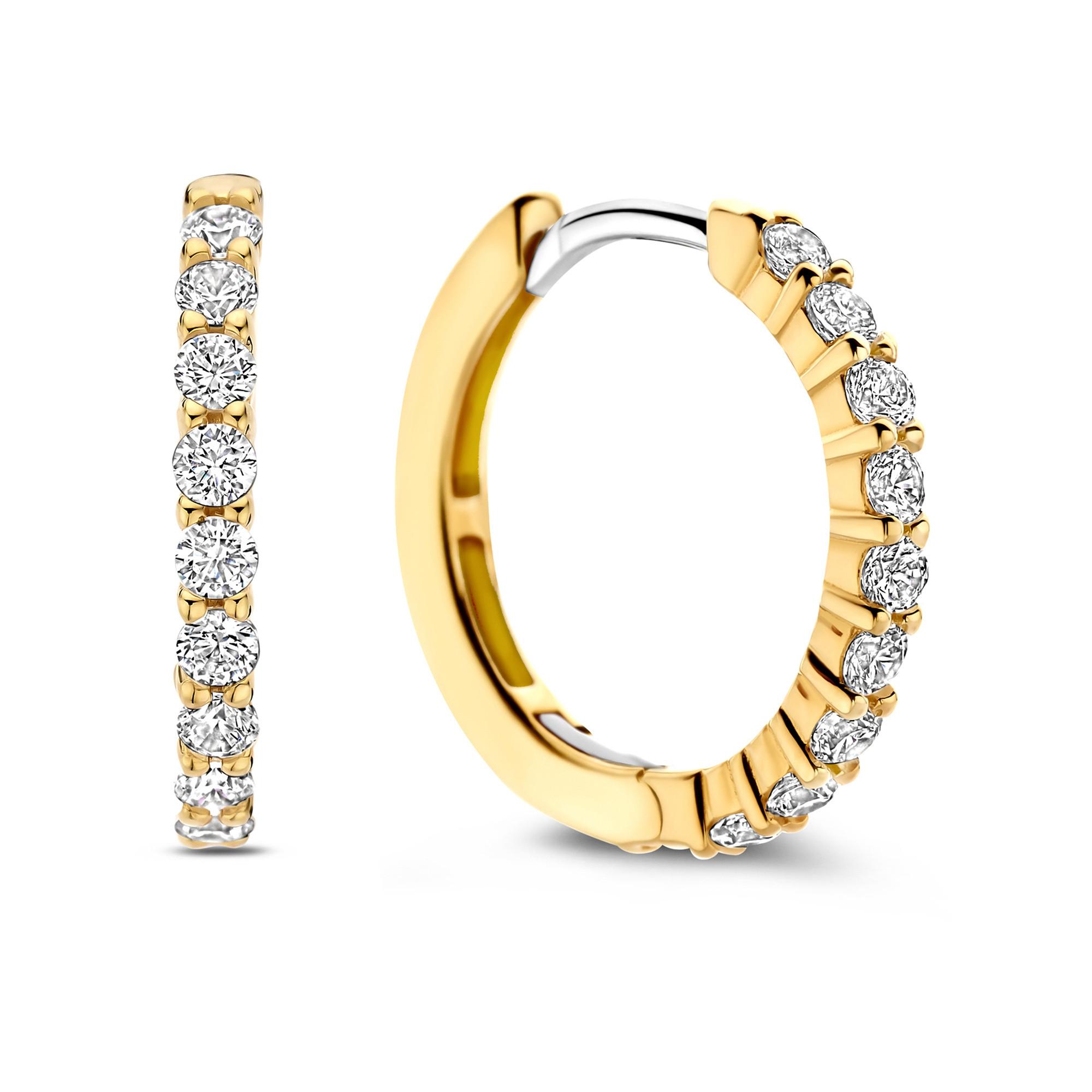 Ces boucles d'oreilles TI SENTO de taille moyenne, plaquées or, serties d'un pavé de zirconium éblouissant, témoignent d'une élégance intemporelle et d'un glamour raffiné. Les boucles d'oreilles fabriquées avec précision en argent sterling 925 de haute qualité et plaquées or ont un diamètre délicat de 18 mm et sont un ajout fascinant à votre collection de bijoux.