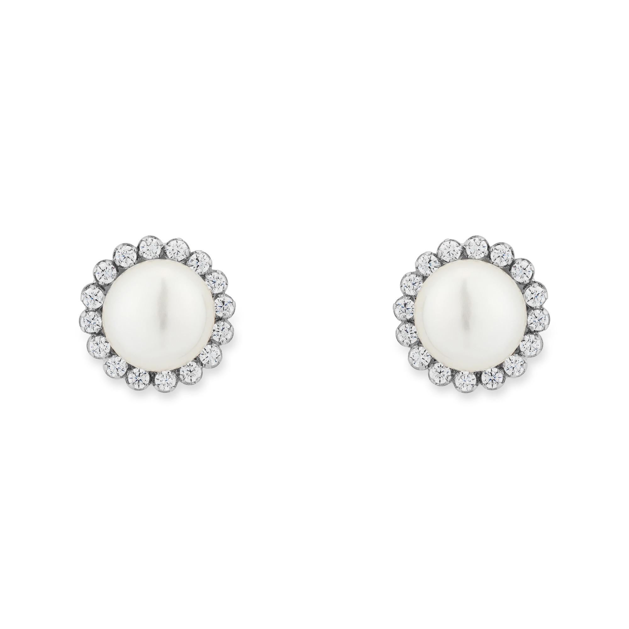 Cette paire de boucles d'oreilles de Puro se compose d'or blanc 18 carats. La forme ronde classique avec la perle d'eau douce au centre est encadrée par du zirconium à facettes. Les bijoux ont une allure nostalgique et raffinée. Les fermetures papillon au dos se ferment facilement et en toute sécurité.